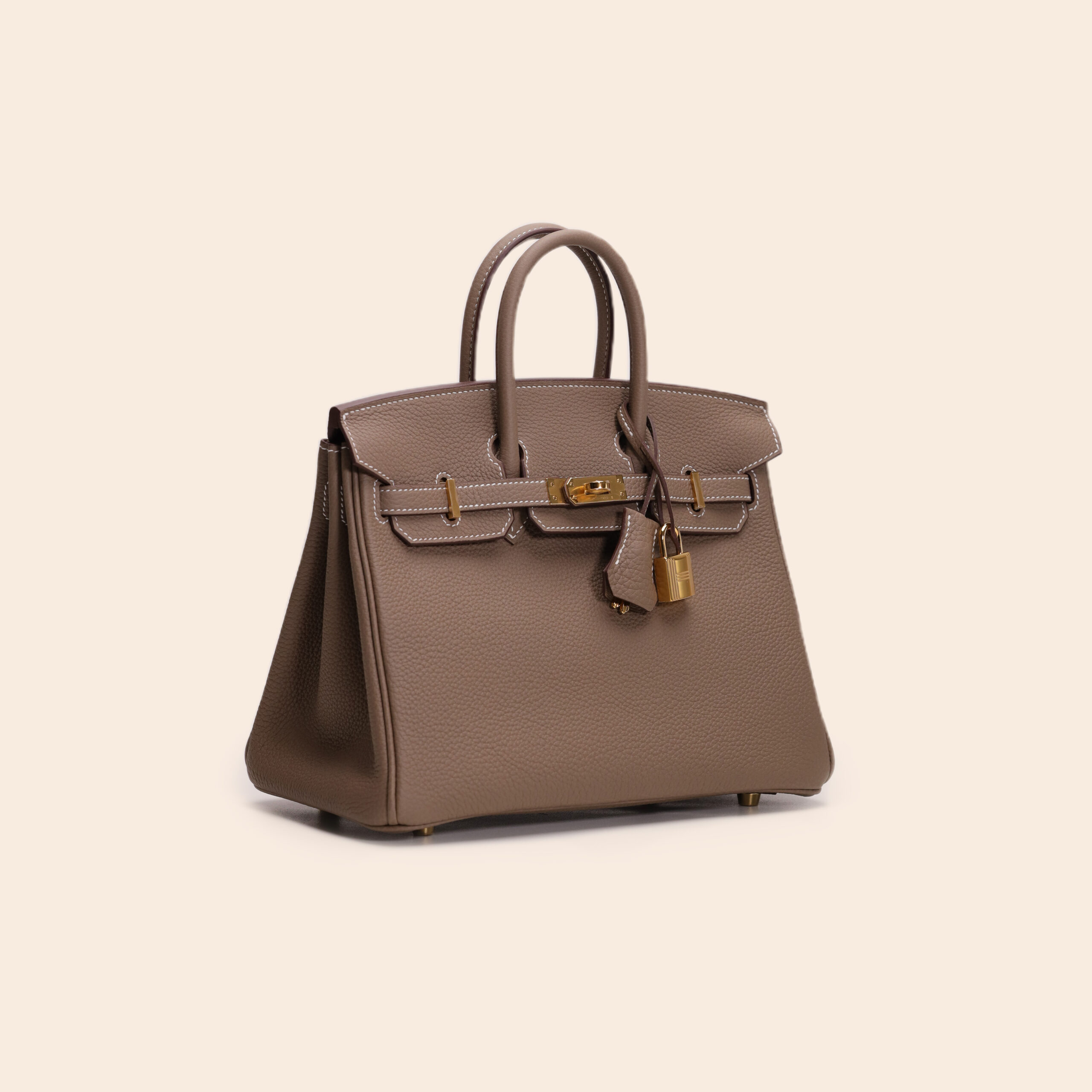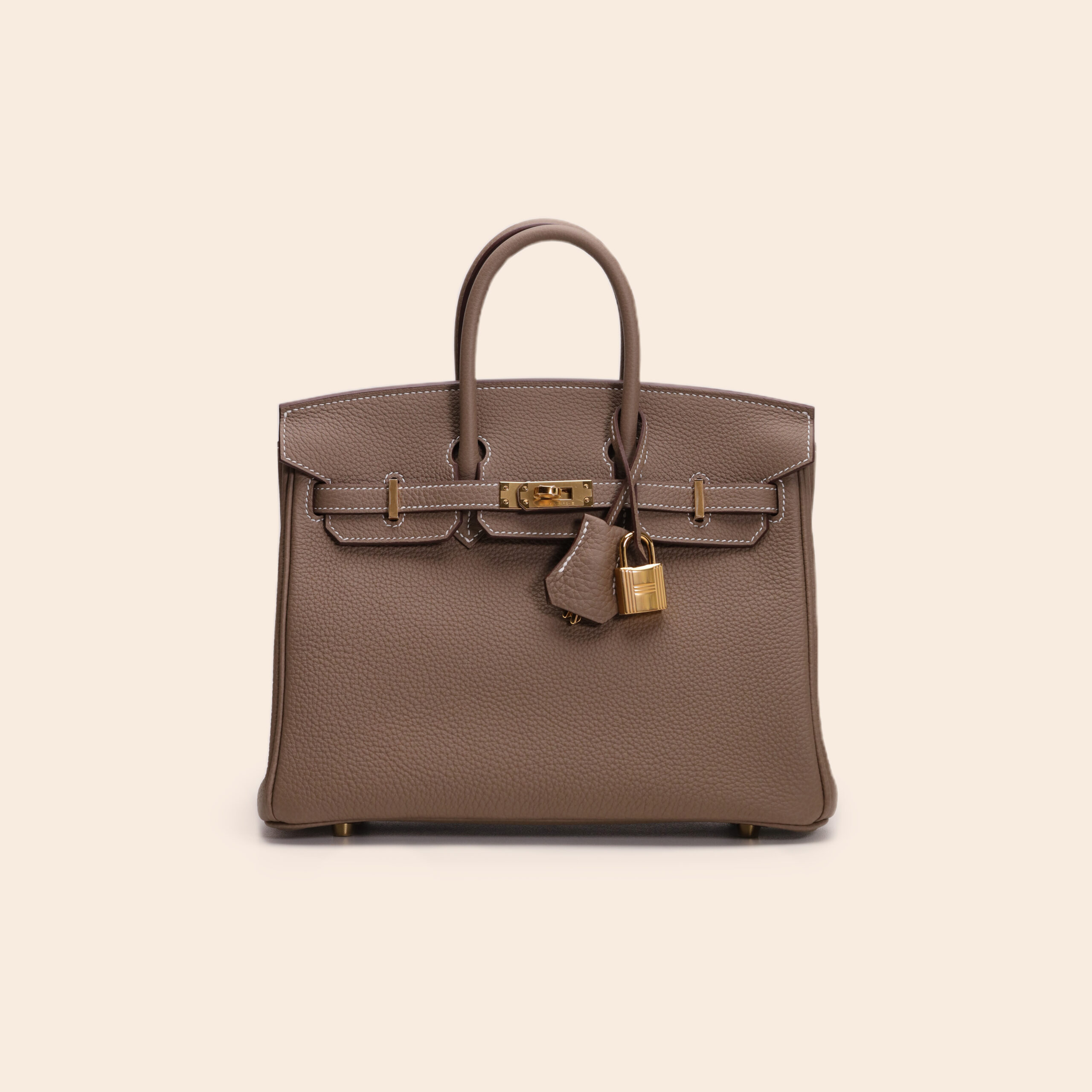 The Hermès Birkin 25 in Etoupe Togo leather with Gold Hardware (GHW), stamp W, is a refined and versatile luxury bag. Crafted from scratch-resistant Togo leather, it features white contrast stitching and elegant gold hardware. The neutral Etoupe shade makes it a perfect everyday statement piece.