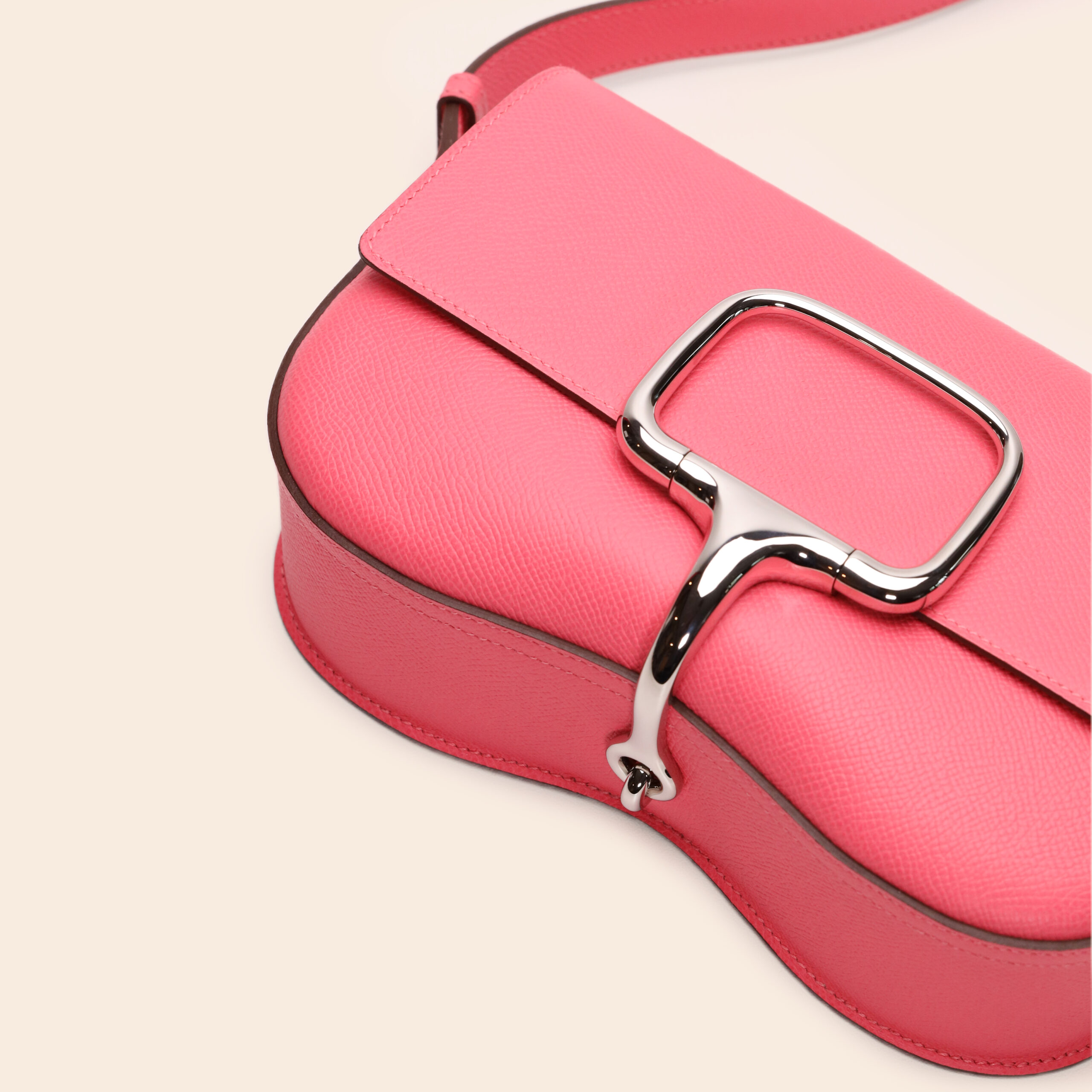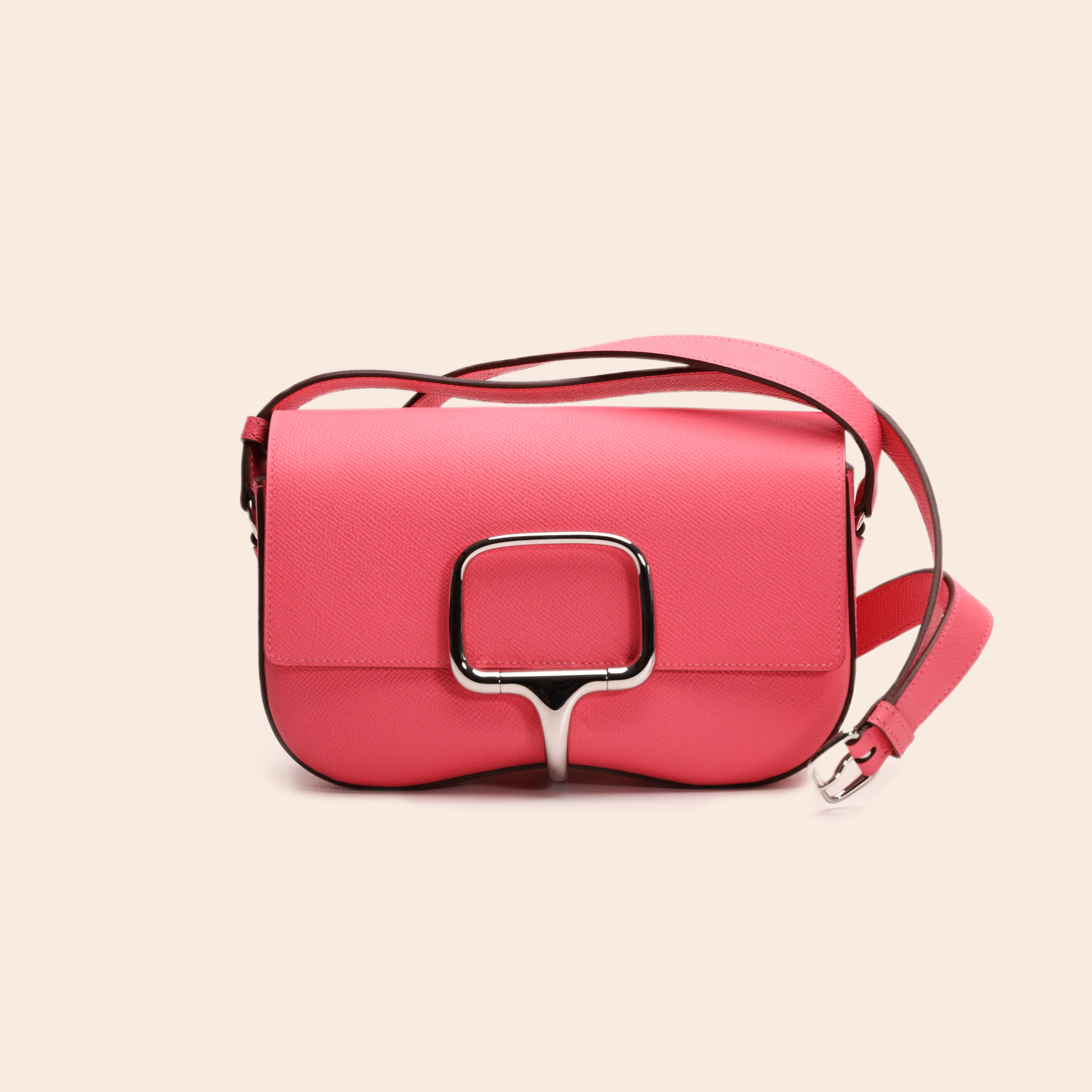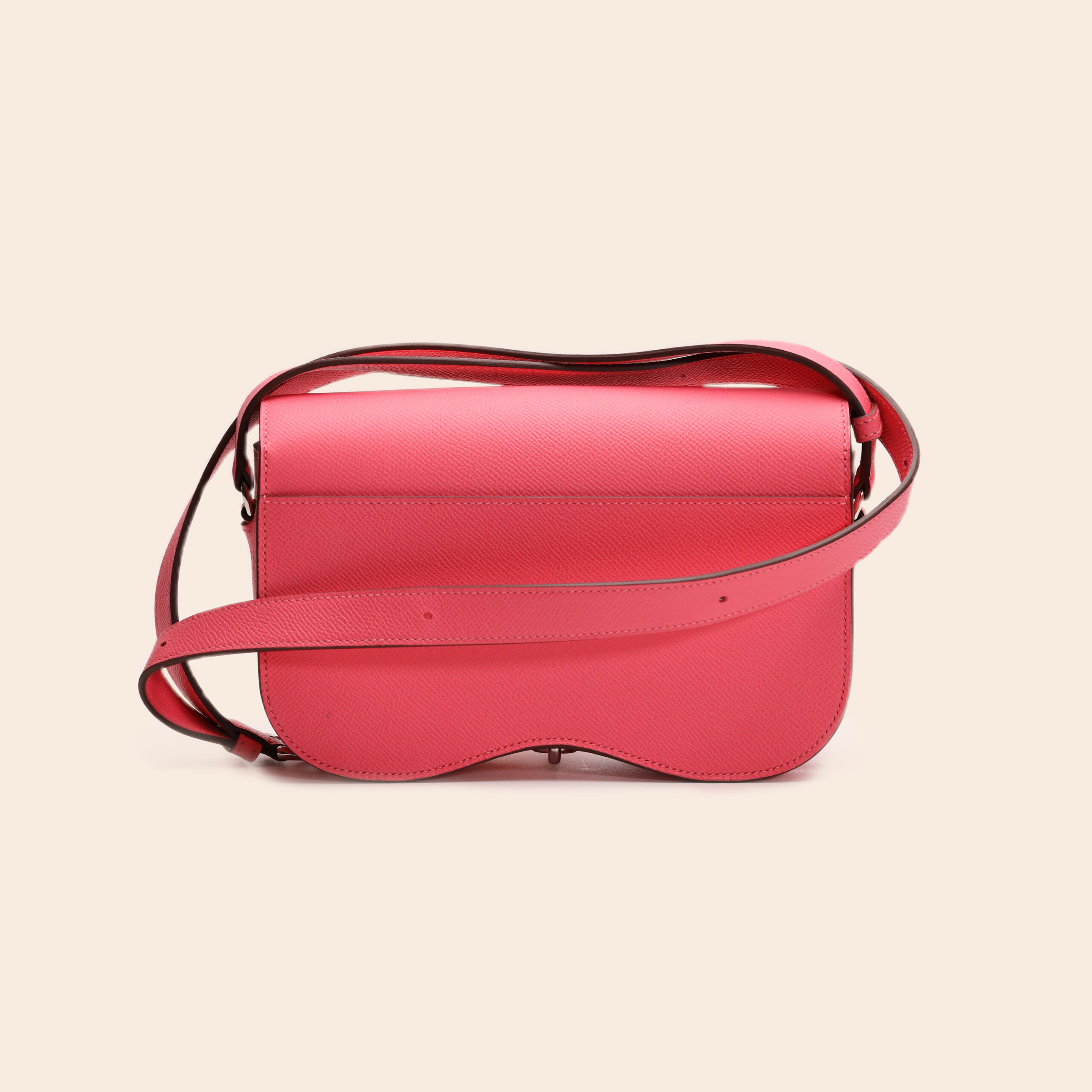 The Hermès Della Cavalleria Elan Rose Azalee Epsom PHW radiates elegant femininity. Crafted from smooth Rose Azalee Epsom leather and finished with palladium hardware, this bag offers a modern yet graceful charm.