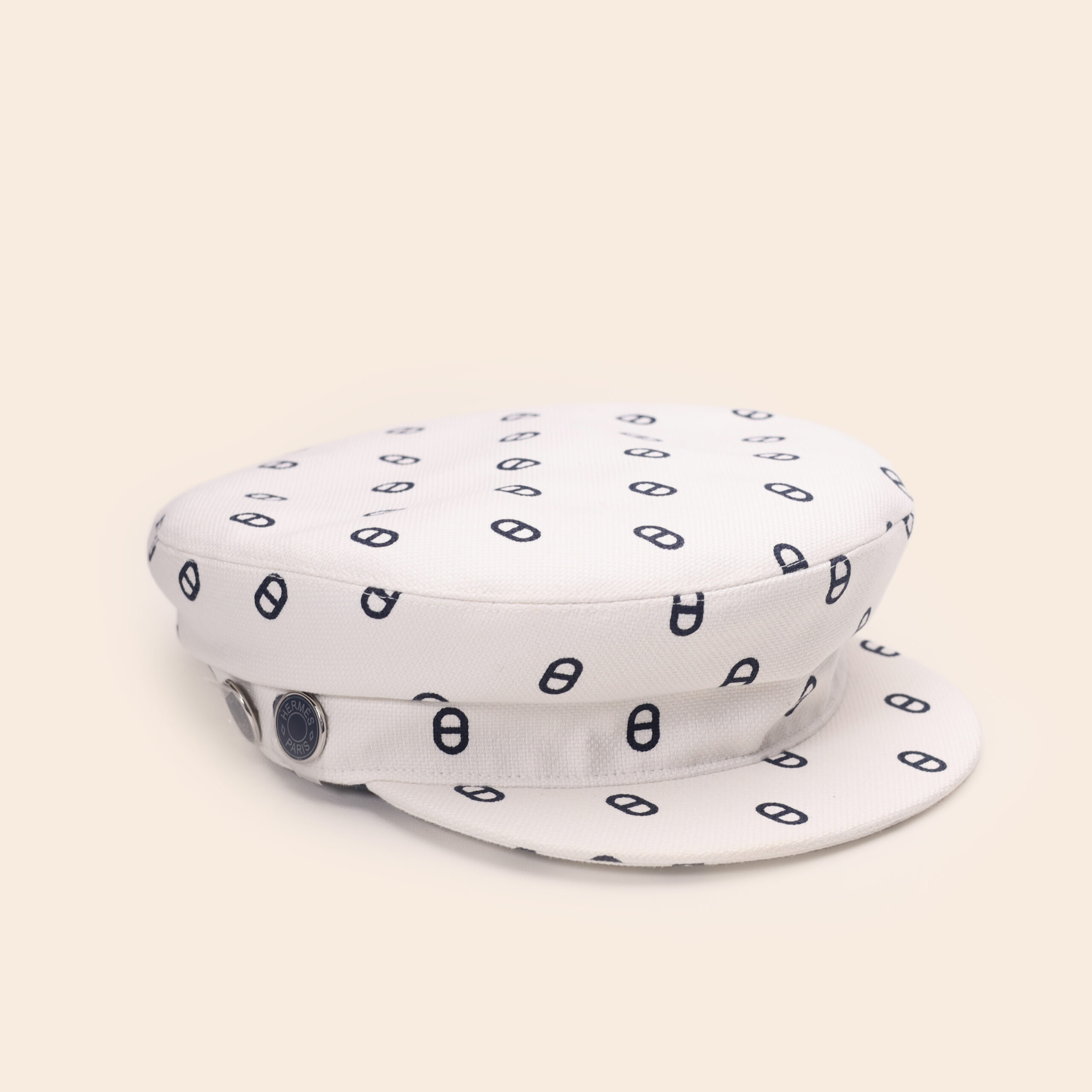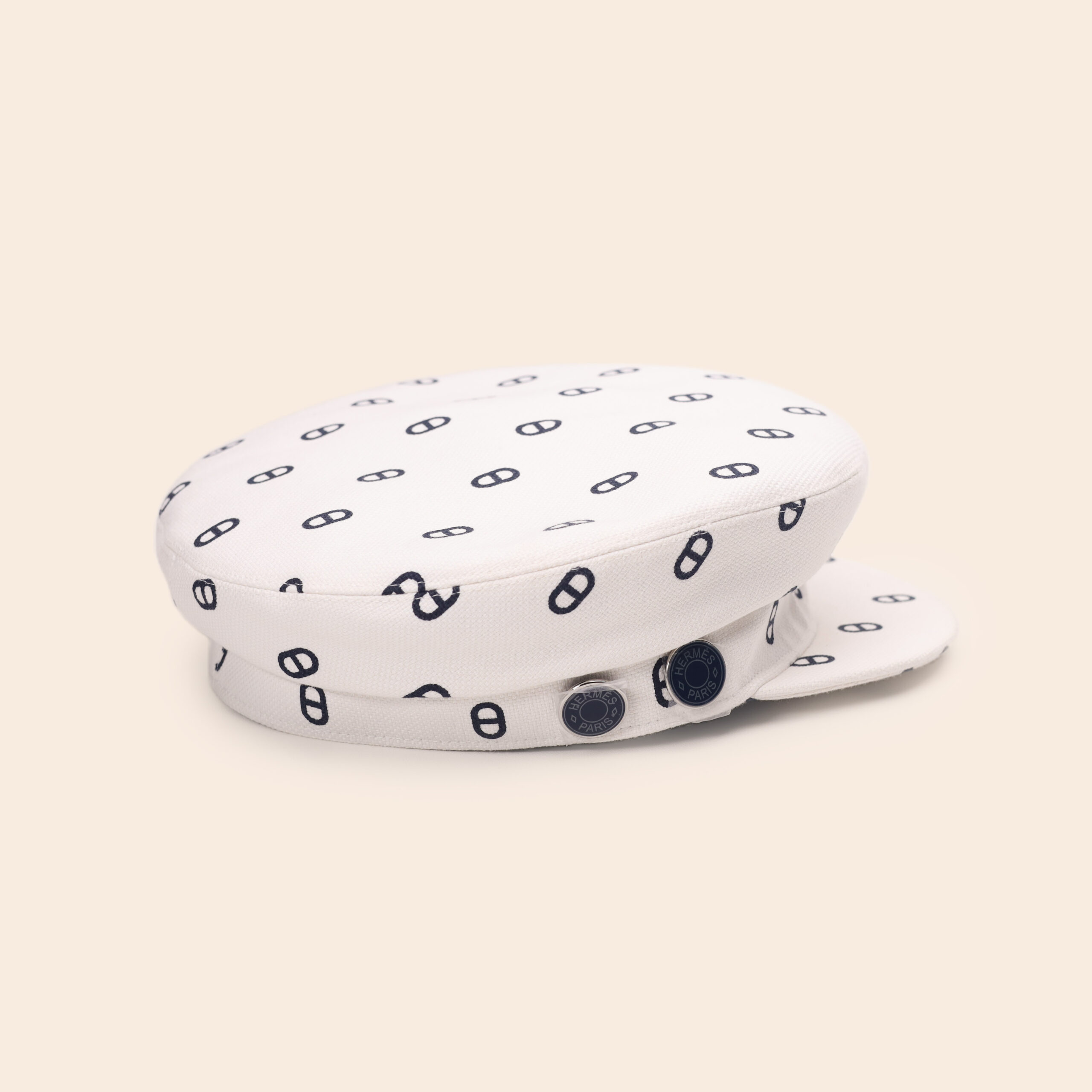 A stylish white hat featuring Hermès’ signature Chaine d’Ancre detail. Minimalist yet luxurious design, perfect for casual or semi-formal looks.