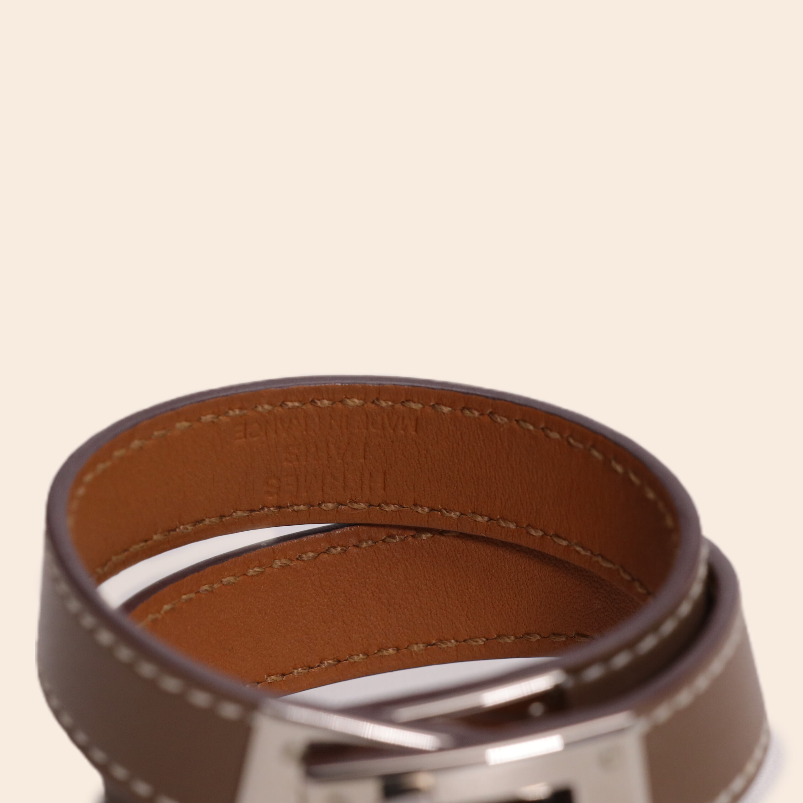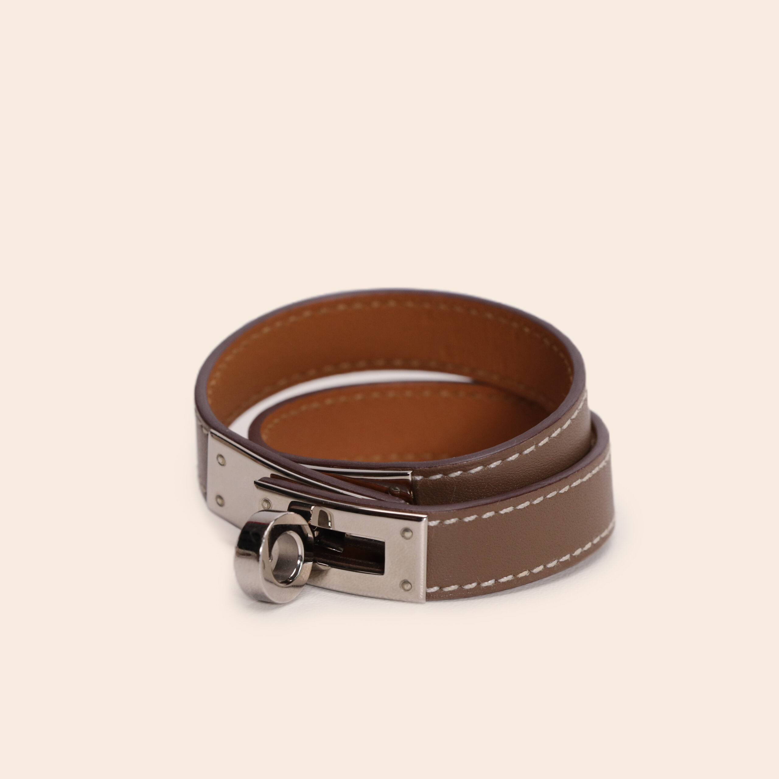 A timeless double-wrap bracelet in classic Etoupe leather, finished with sleek palladium hardware. An elegant accessory for a sophisticated daily look.