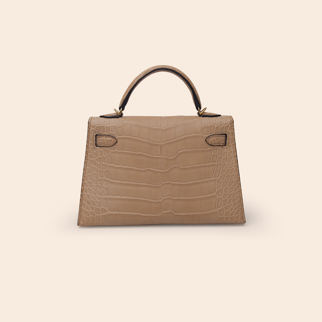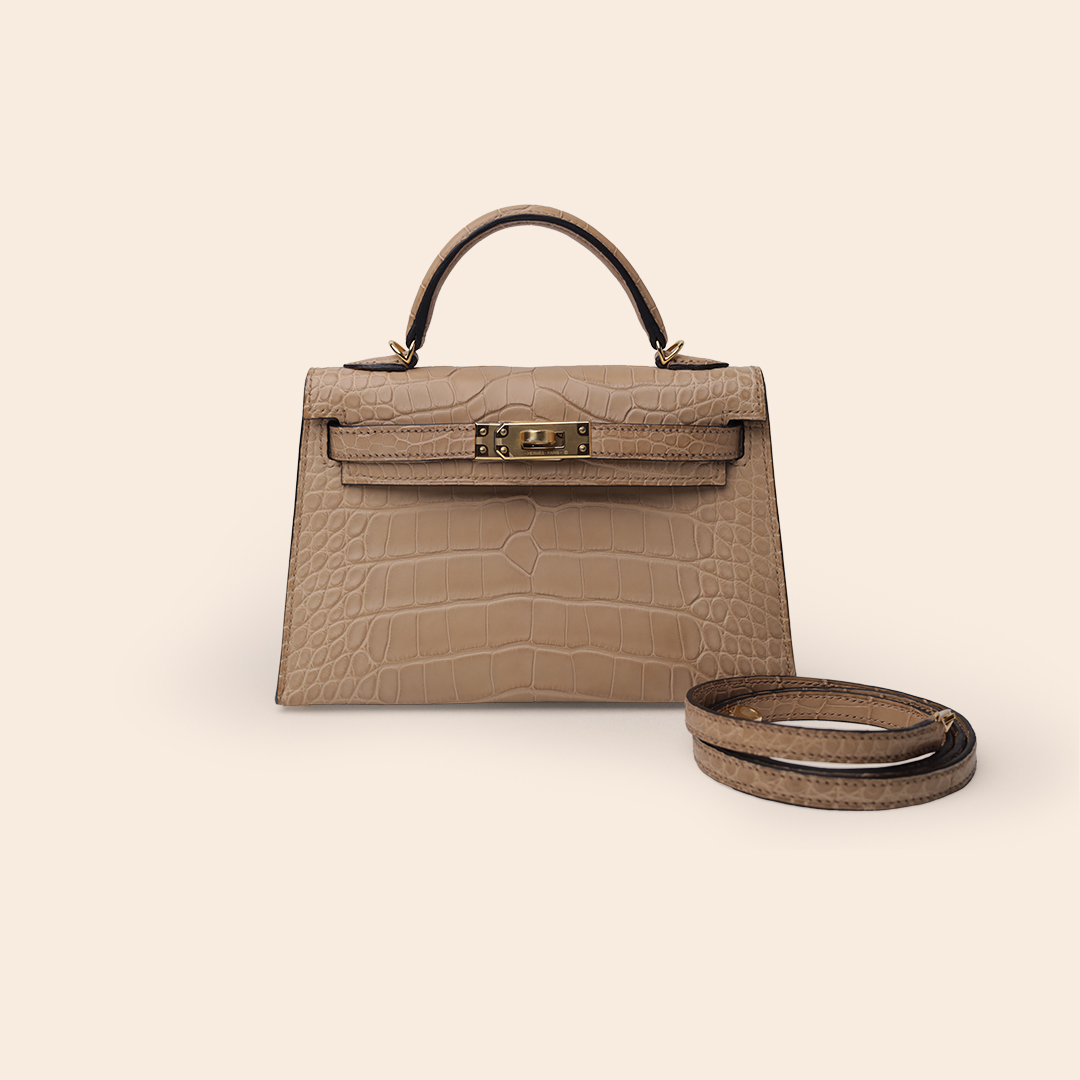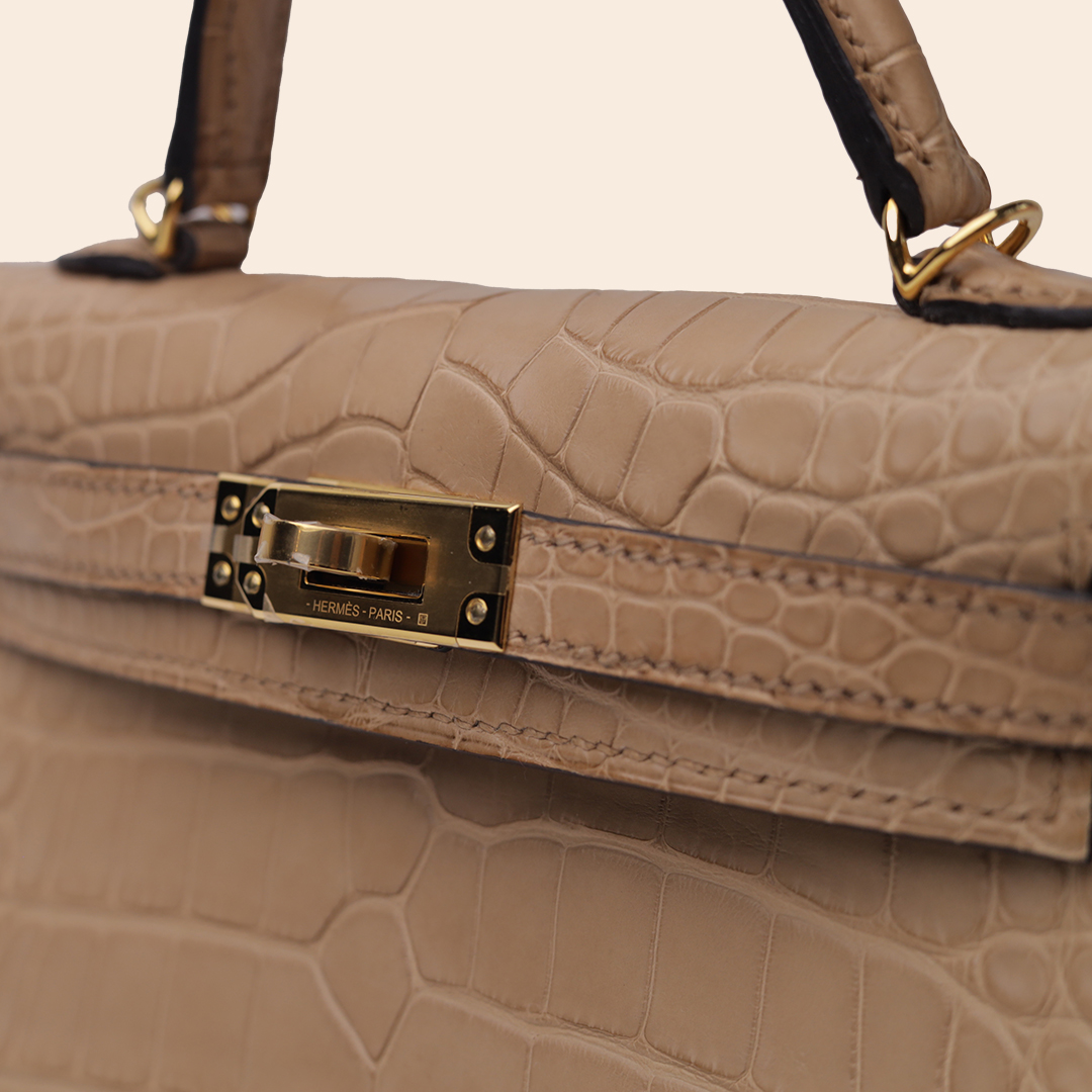 The Hermès Kelly 20 in Chai, crafted from luxurious Matte Alligator leather with a refined texture. Finished with Gold Hardware (GHW), this iconic mini bag exudes elegance, exclusivity, and timeless sophistication—an exceptional collector’s piece.