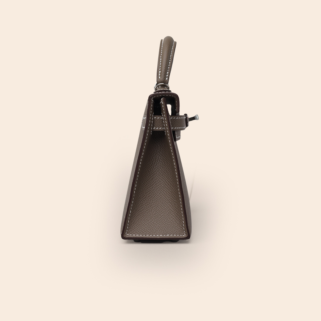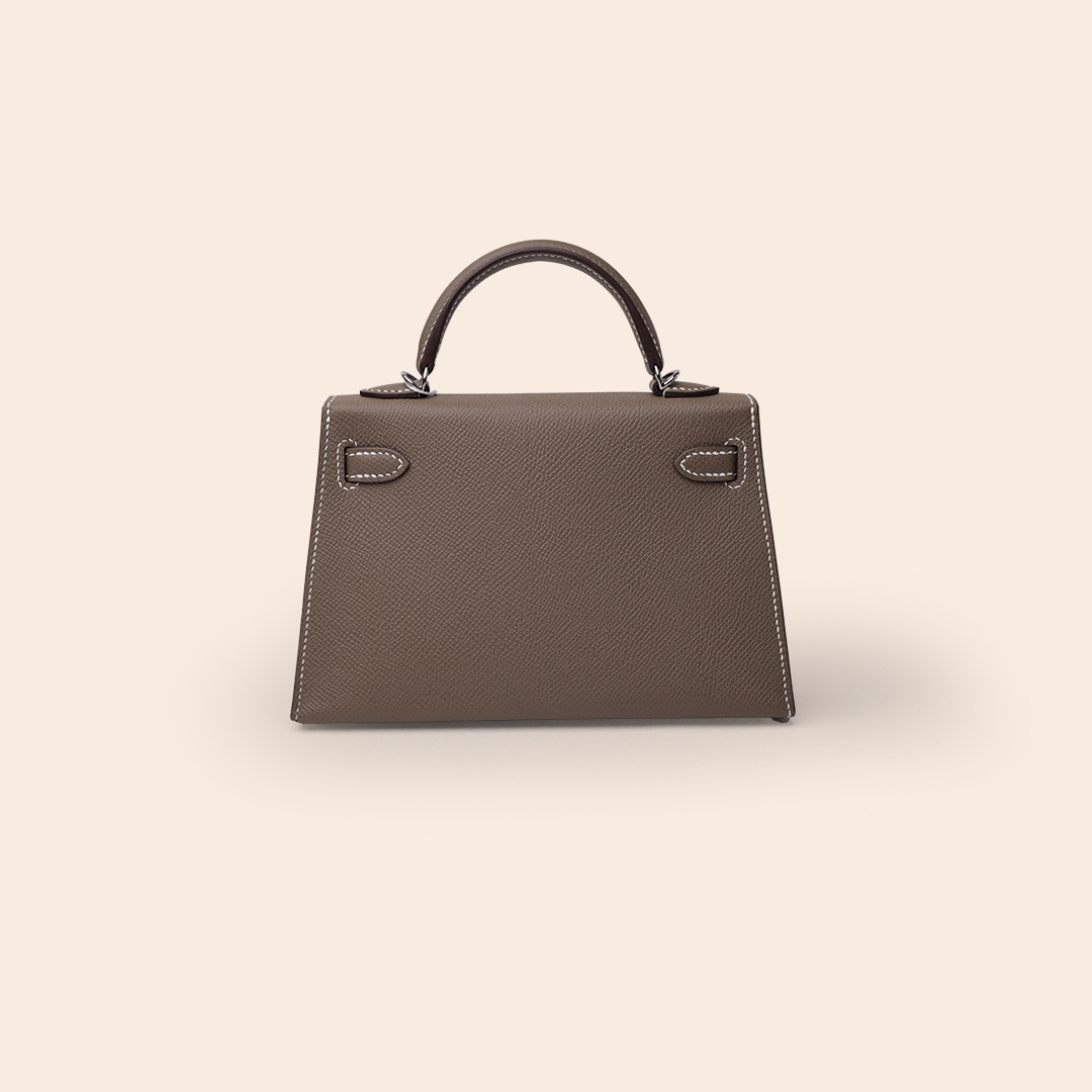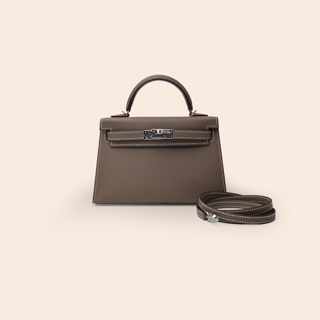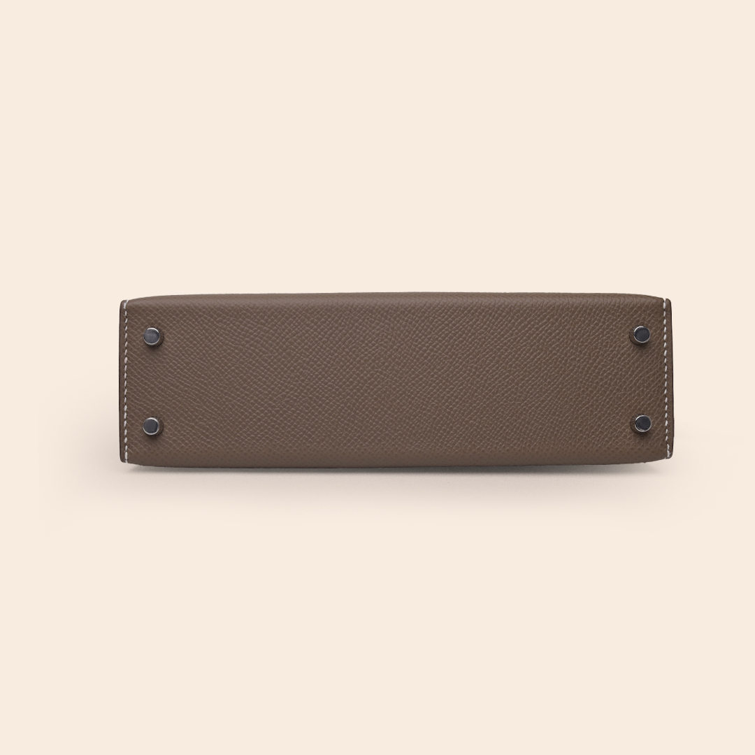 The Hermès Kelly 20 in Etoupe, crafted from durable and scratch-resistant Epsom leather. Finished with Palladium Hardware (PHW), this iconic mini bag offers a refined, neutral, and timeless look, perfect for versatile styling.