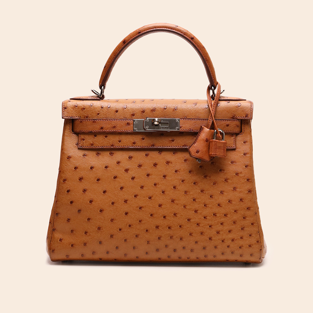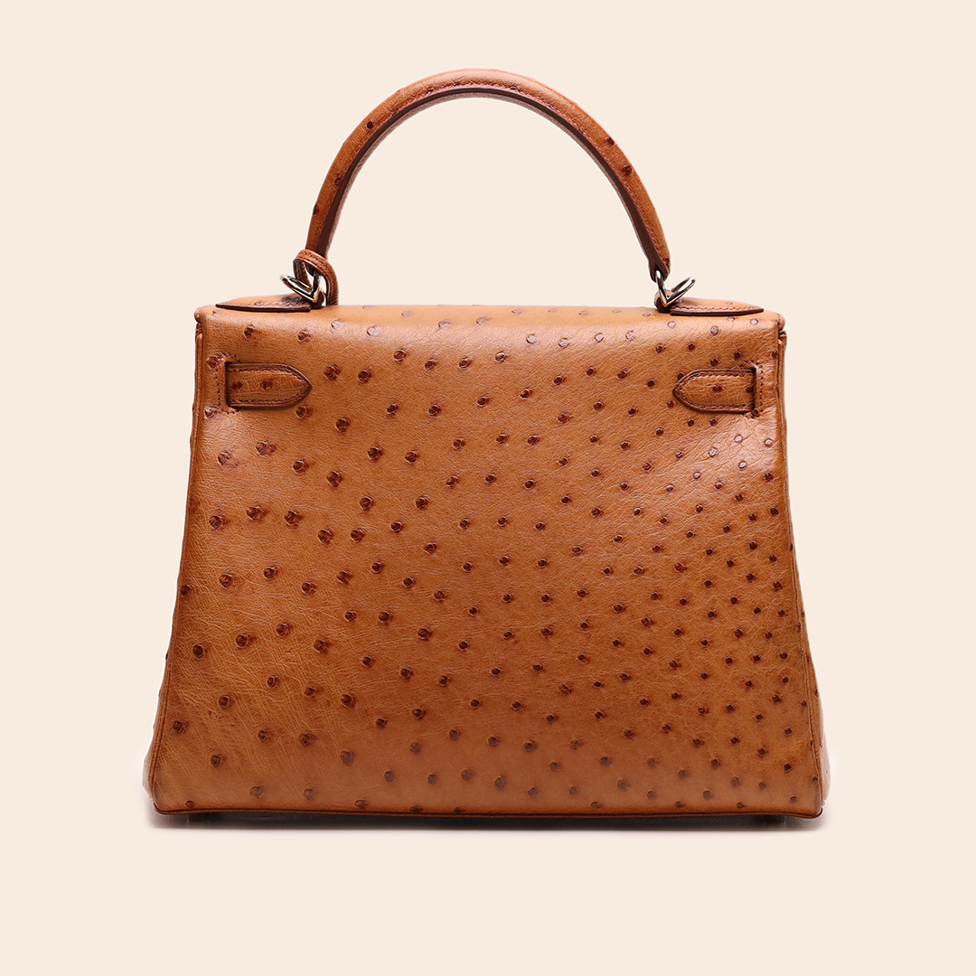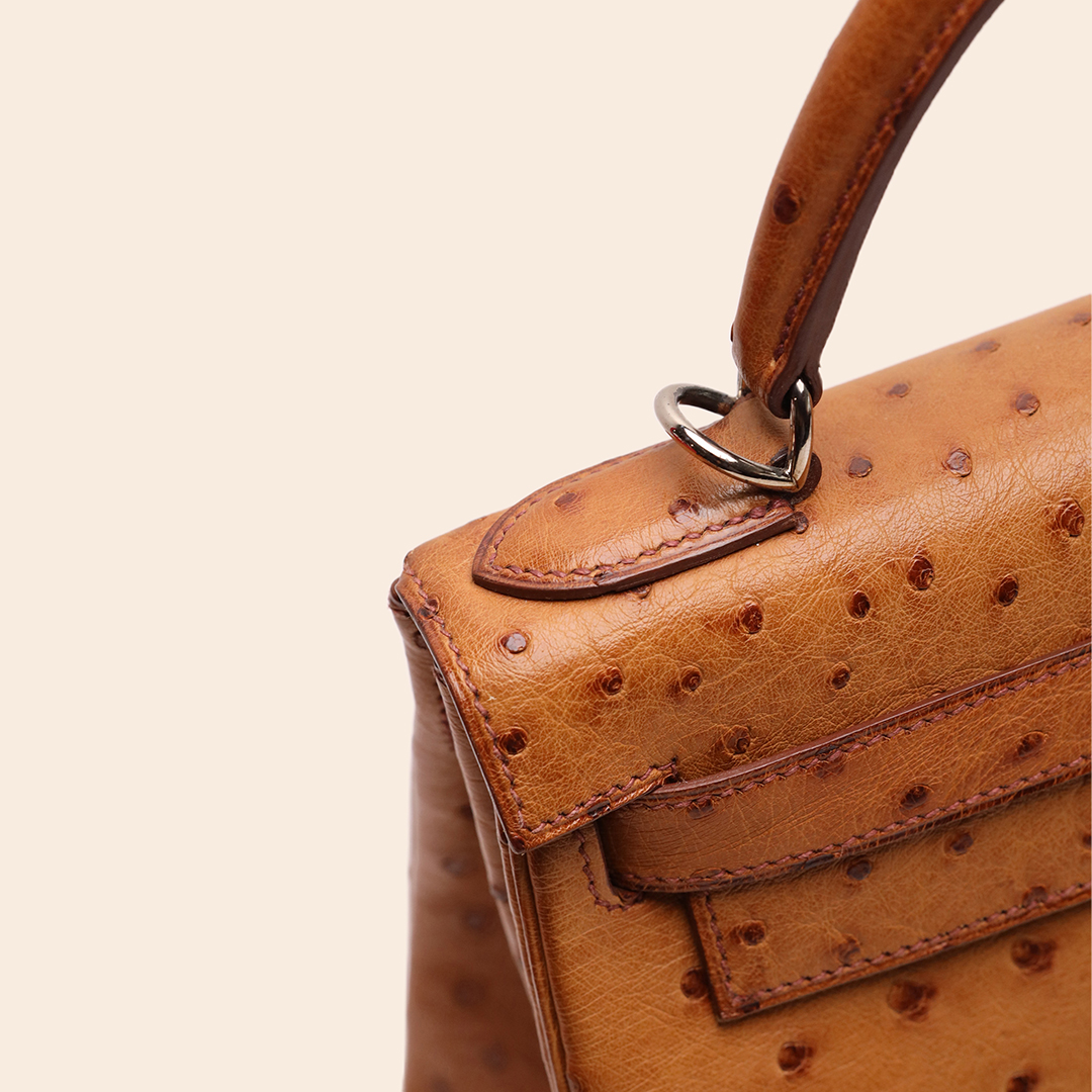 The Hermès Kelly 28 in timeless Gold, crafted from luxurious ostrich leather with distinctive natural quill marks. Finished with sleek palladium hardware. M stamp (2009). A refined and exotic medium-sized bag—ideal for sophisticated daily wear or rare collection pieces.