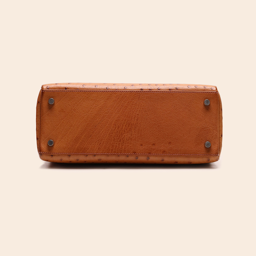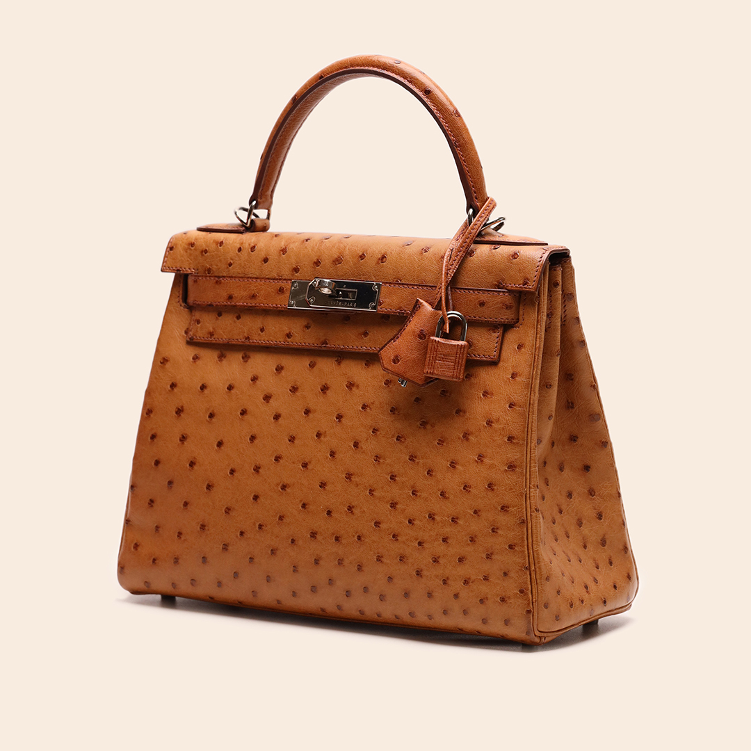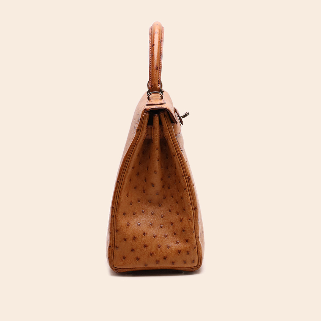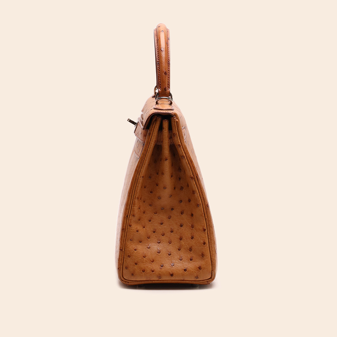 The Hermès Kelly 28 in timeless Gold, crafted from luxurious ostrich leather with distinctive natural quill marks. Finished with sleek palladium hardware. M stamp (2009). A refined and exotic medium-sized bag—ideal for sophisticated daily wear or rare collection pieces.