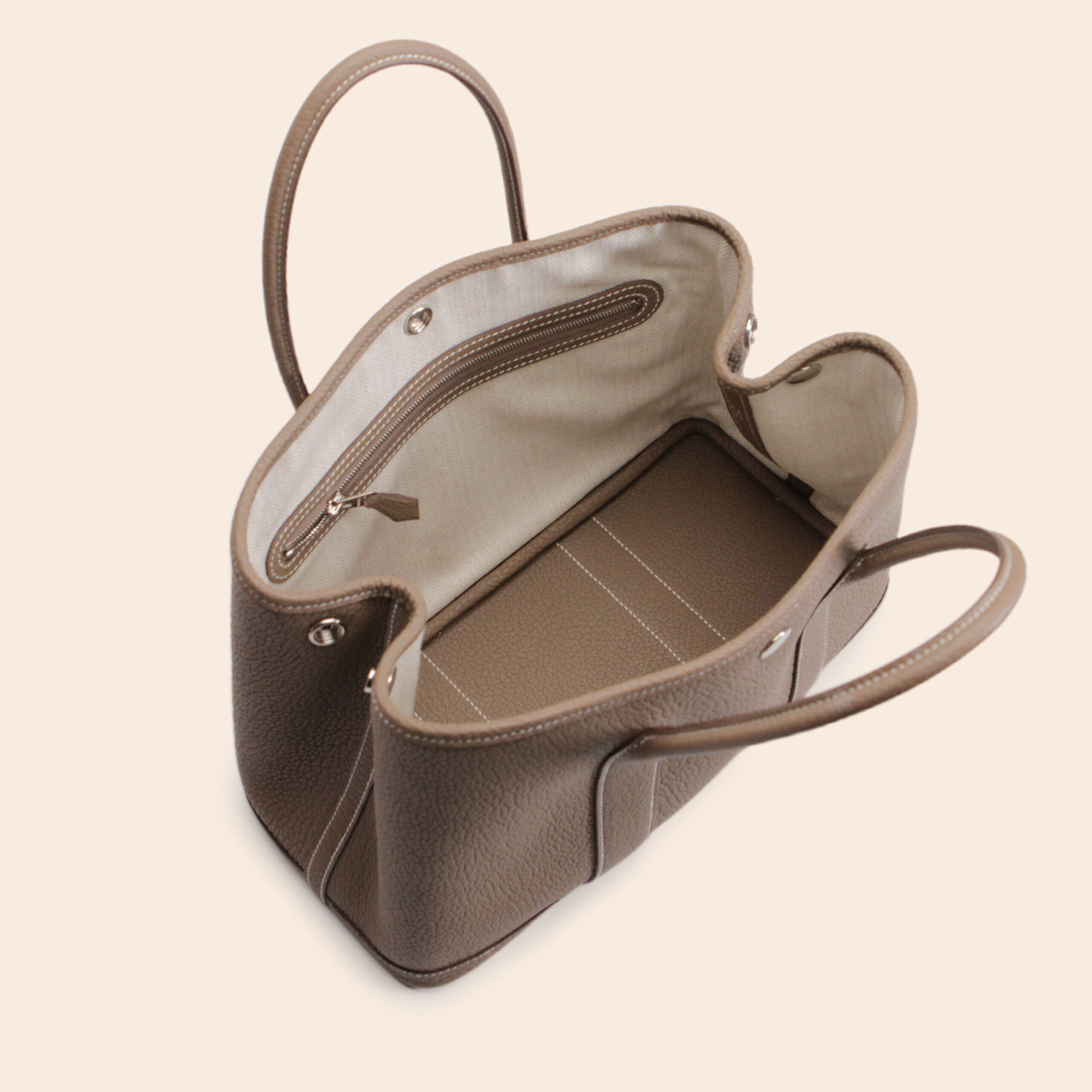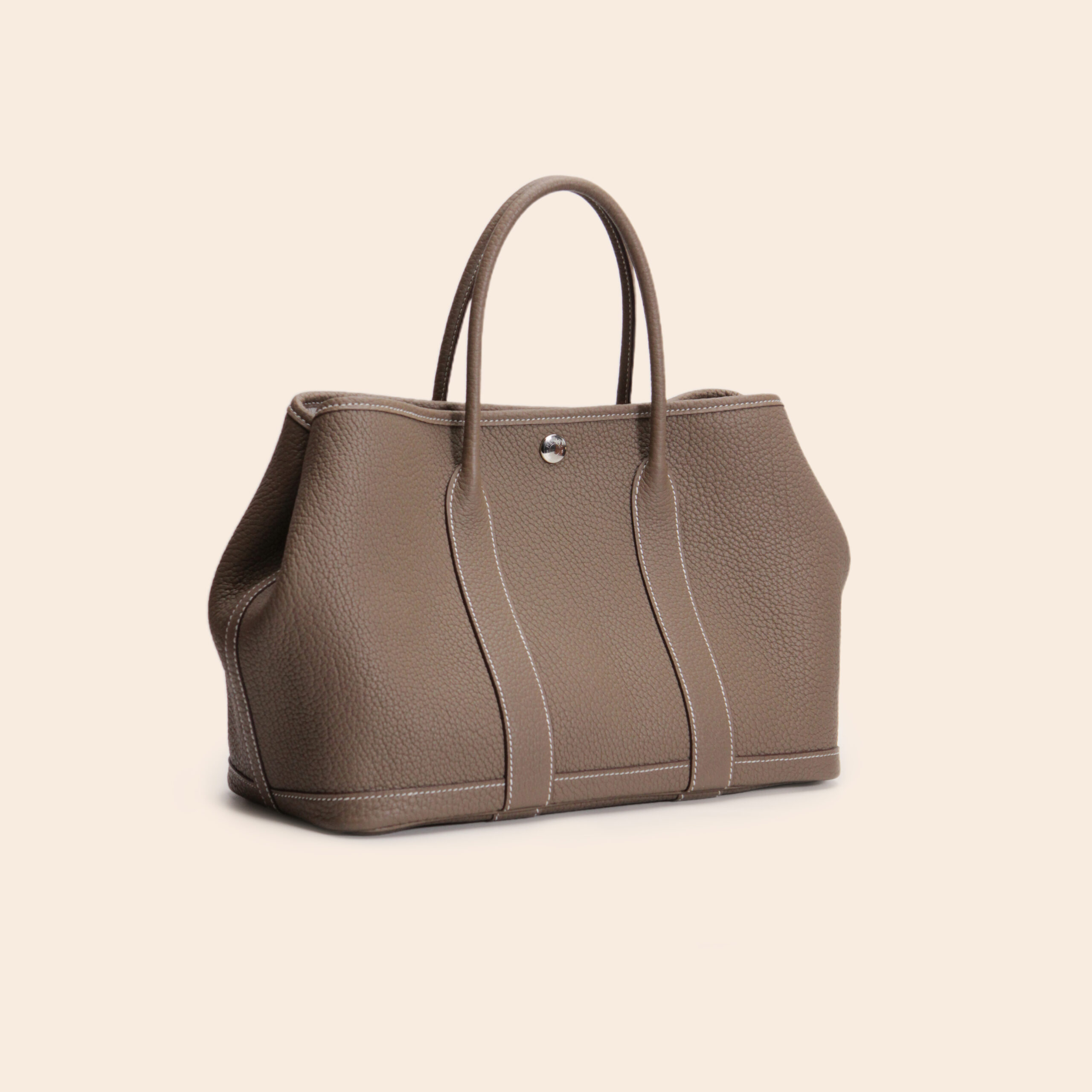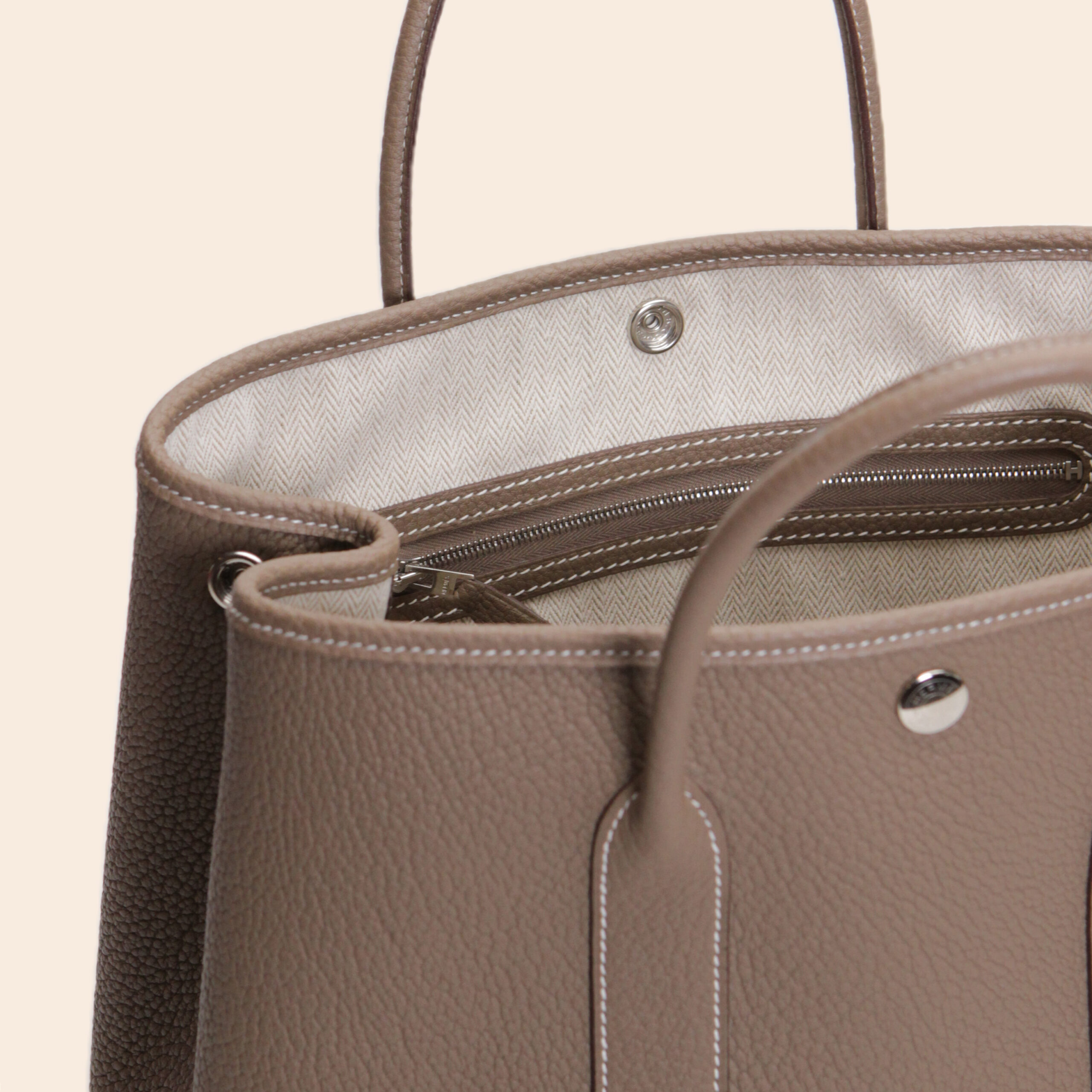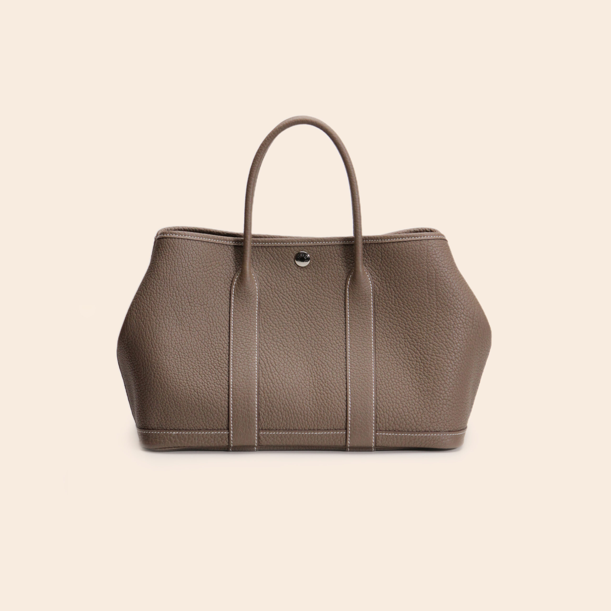 The Hermès Garden Party 30 in Etoupe Negonda leather with Palladium Hardware (PHW), stamp U, is a timeless and practical tote bag in like new condition. Made from durable, grained Negonda leather, it offers a casual yet refined look. The classic Etoupe color with white contrast stitching adds elegance and versatility—perfect for daily wear.