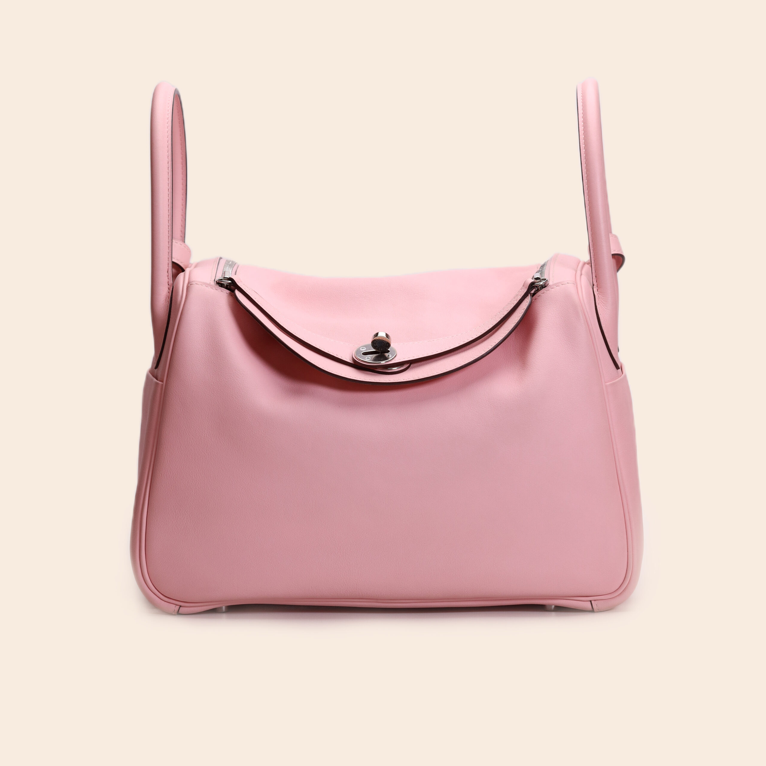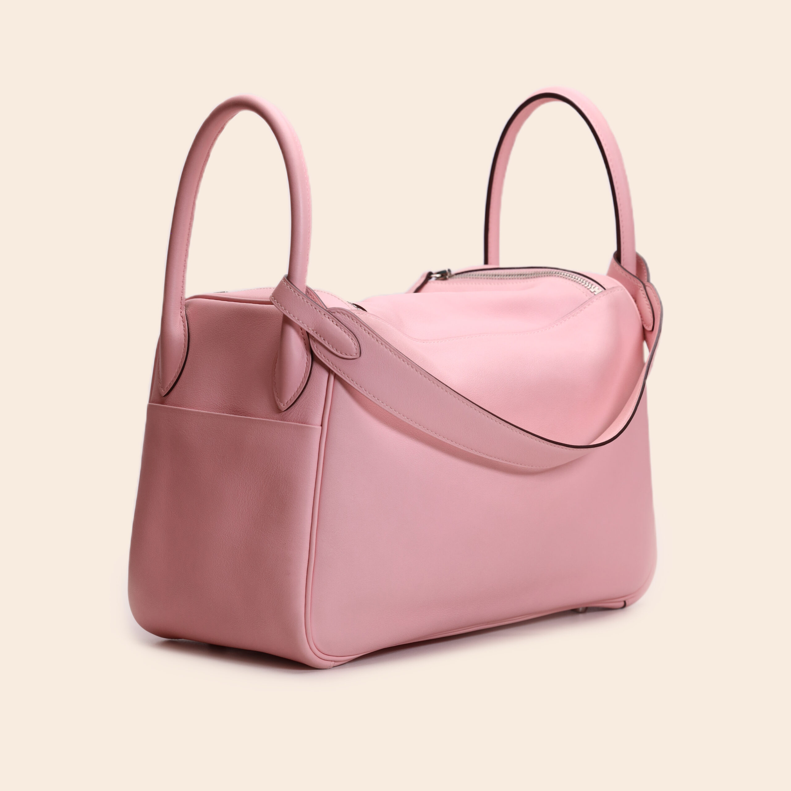 The Hermès Lindy 30 in delicate Rose Sakura, a soft pastel pink that exudes femininity and elegance. Made from smooth, supple Swift leather, accented with modern palladium hardware. X stamp (2016). Perfect for casual luxury and effortlessly feminine daily style.