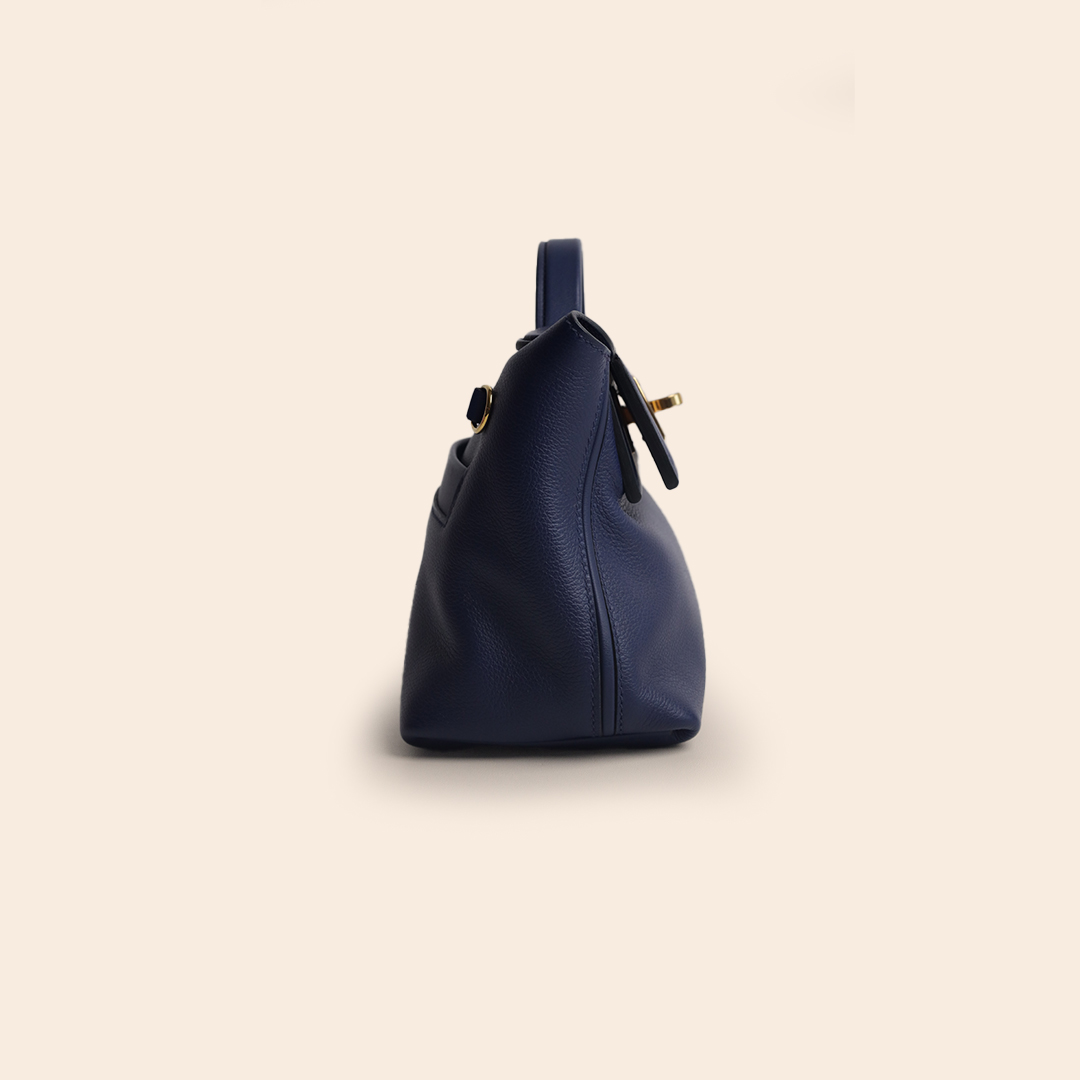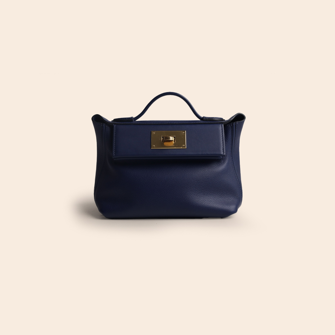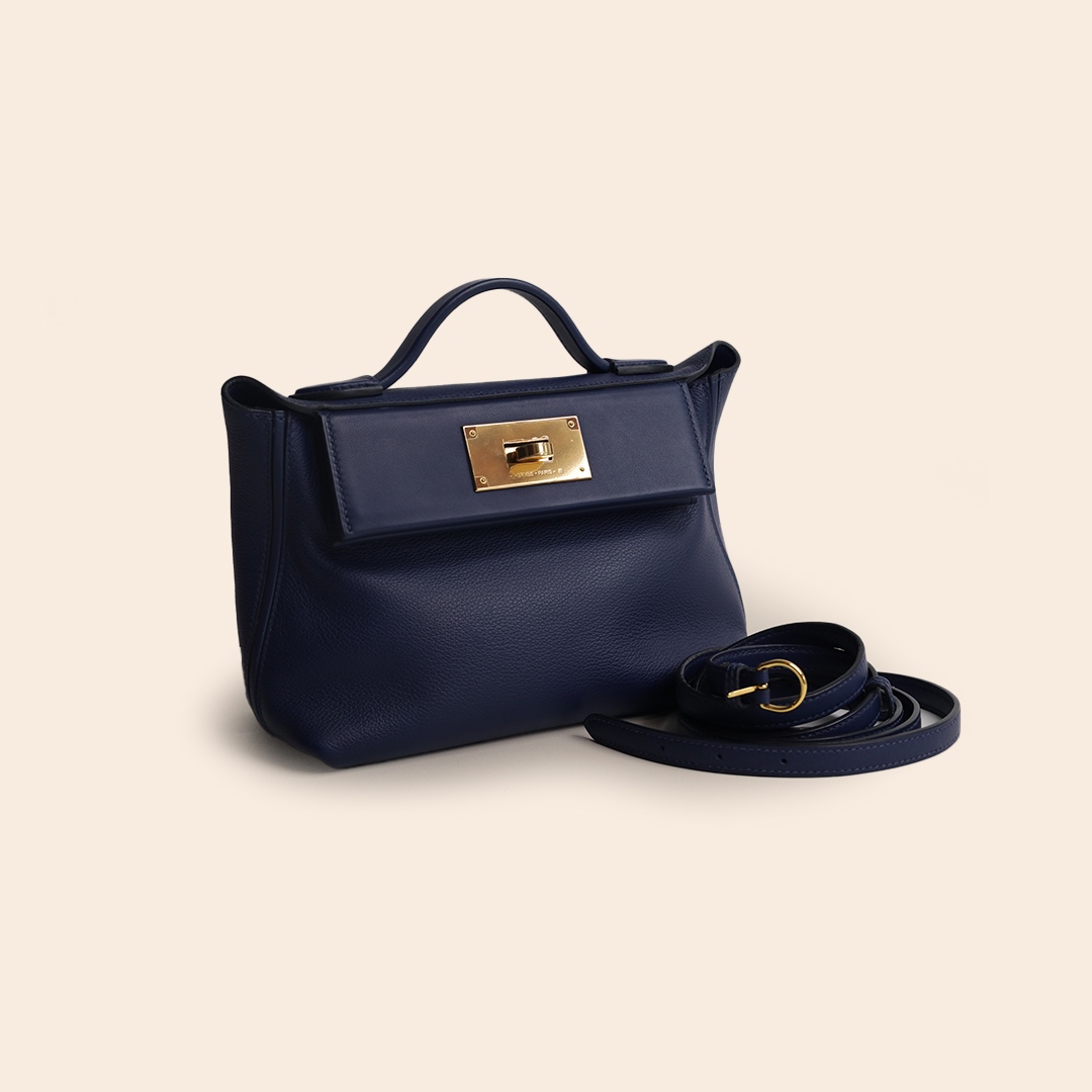 The Hermès Mini 24/24 Blue Sapphire Evercolor GHW is a chic mini-sized handbag featuring a modern, structured silhouette. Crafted from Evercolor leather in a rich Blue Sapphire tone and finished with Gold Hardware, it delivers a refined and luxurious appeal.