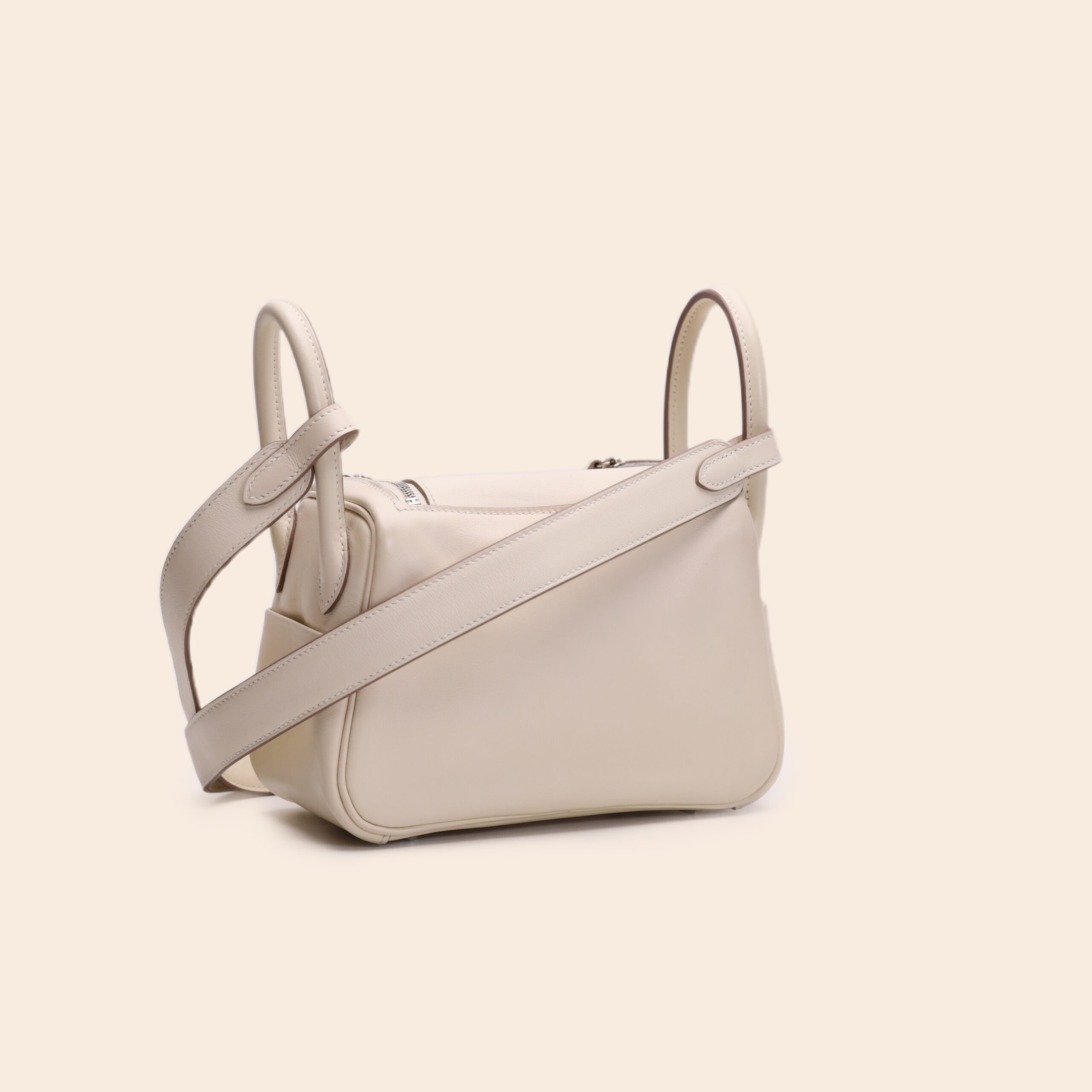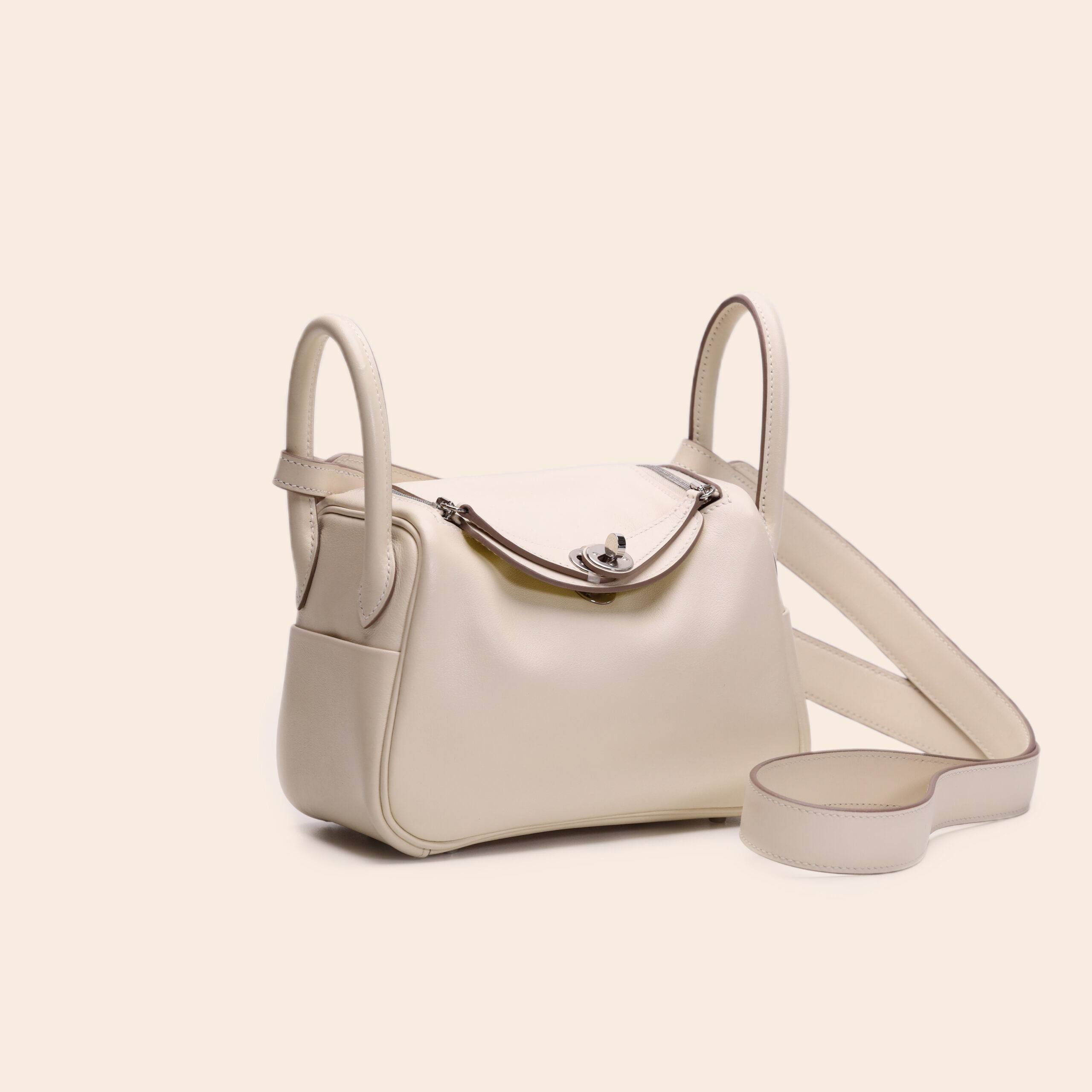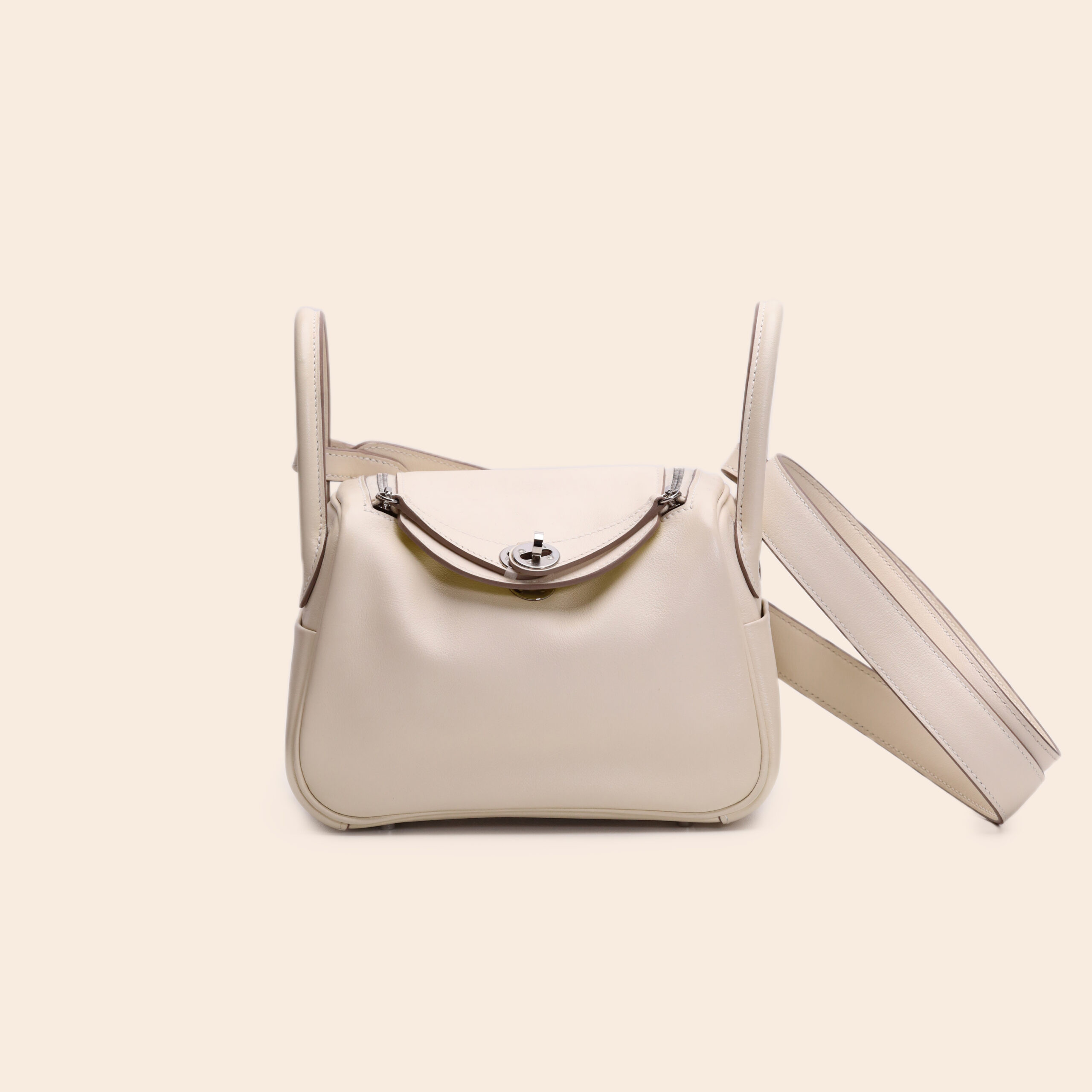 The Hermès Mini Lindy in Craie with a fun pop of Lime on the interior. Made from soft and supple Swift leather, finished with sleek palladium hardware. B stamp (2023). A compact and stylish bag—perfect for adding a playful touch to any casual-chic look.