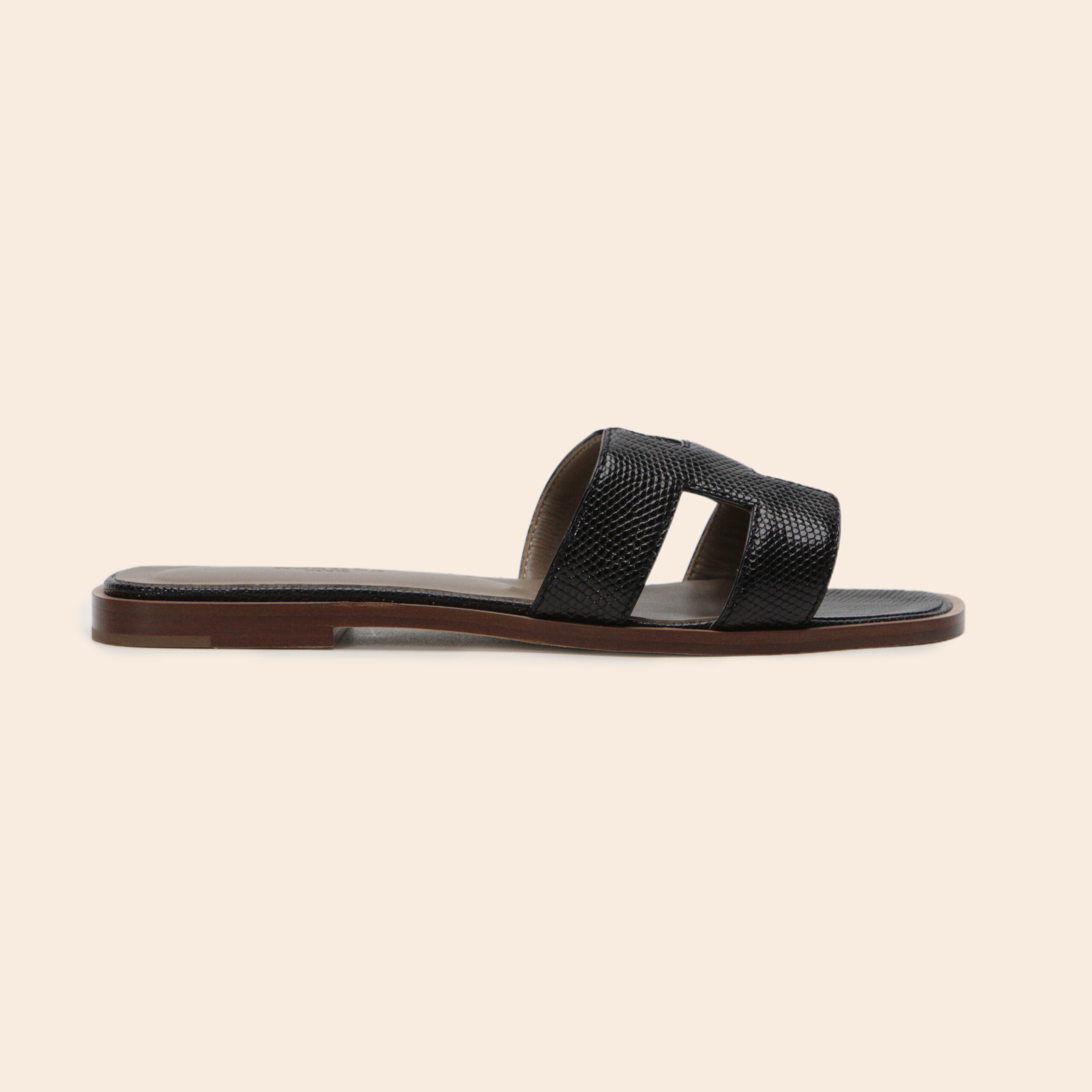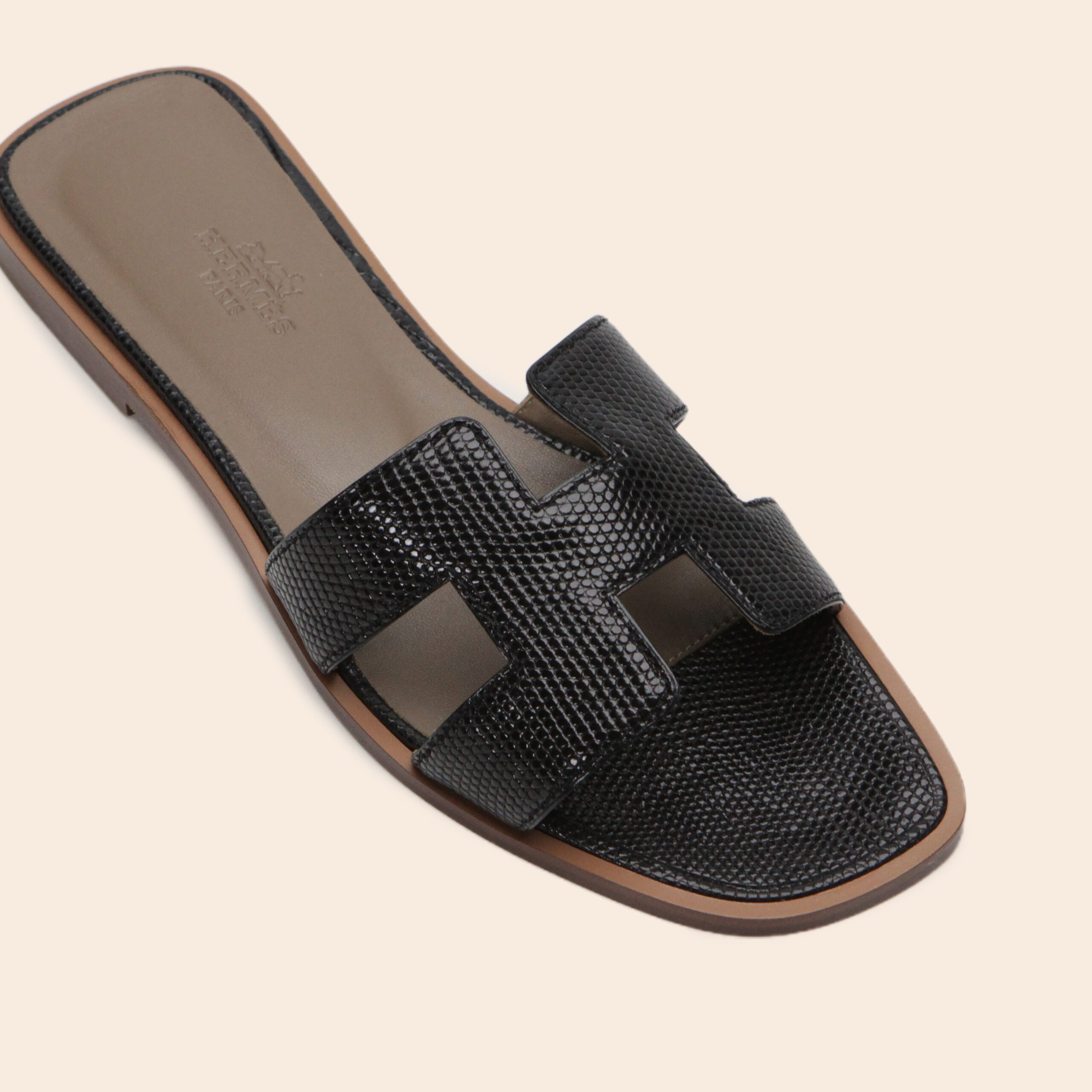 The iconic Oran sandal in luxurious black lizard leather features Hermès’ signature “H” cut-out design. Lightweight and elegant — perfect for relaxed yet refined looks. A sophisticated exotic touch to elevate your footwear collection.
