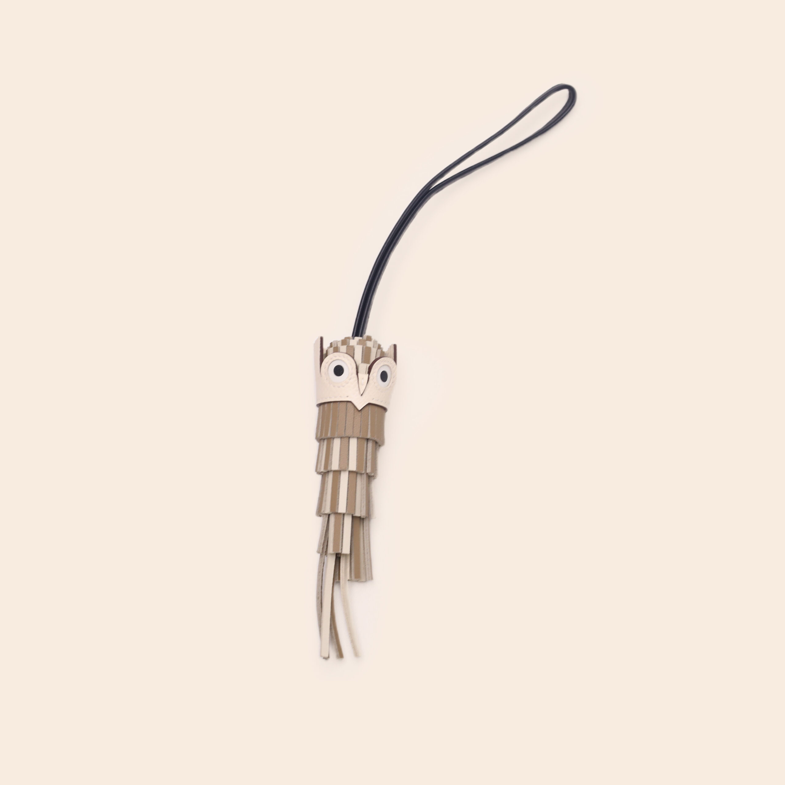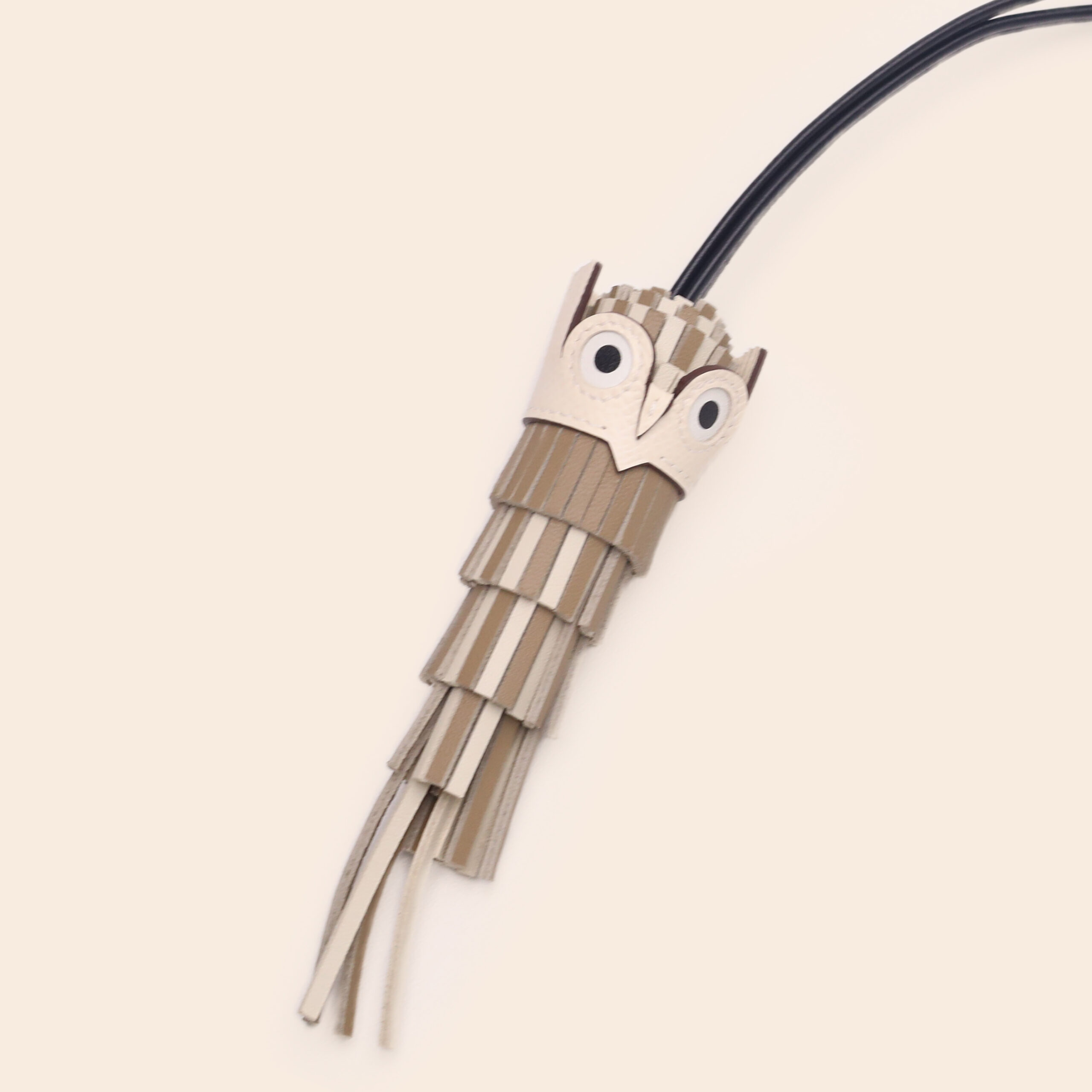 A whimsical and artistic owl-shaped charm in a chic mix of neutral tones: marfa, nata, craie, blanc, and black. Crafted from premium leather—perfect as a playful accessory for your Hermès bag.