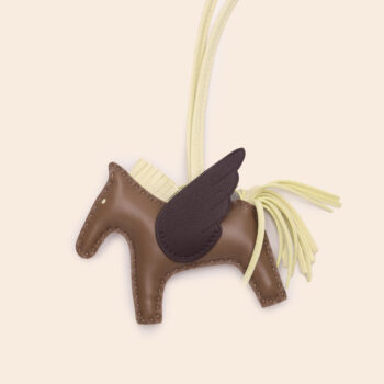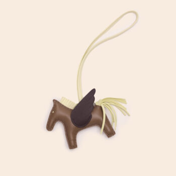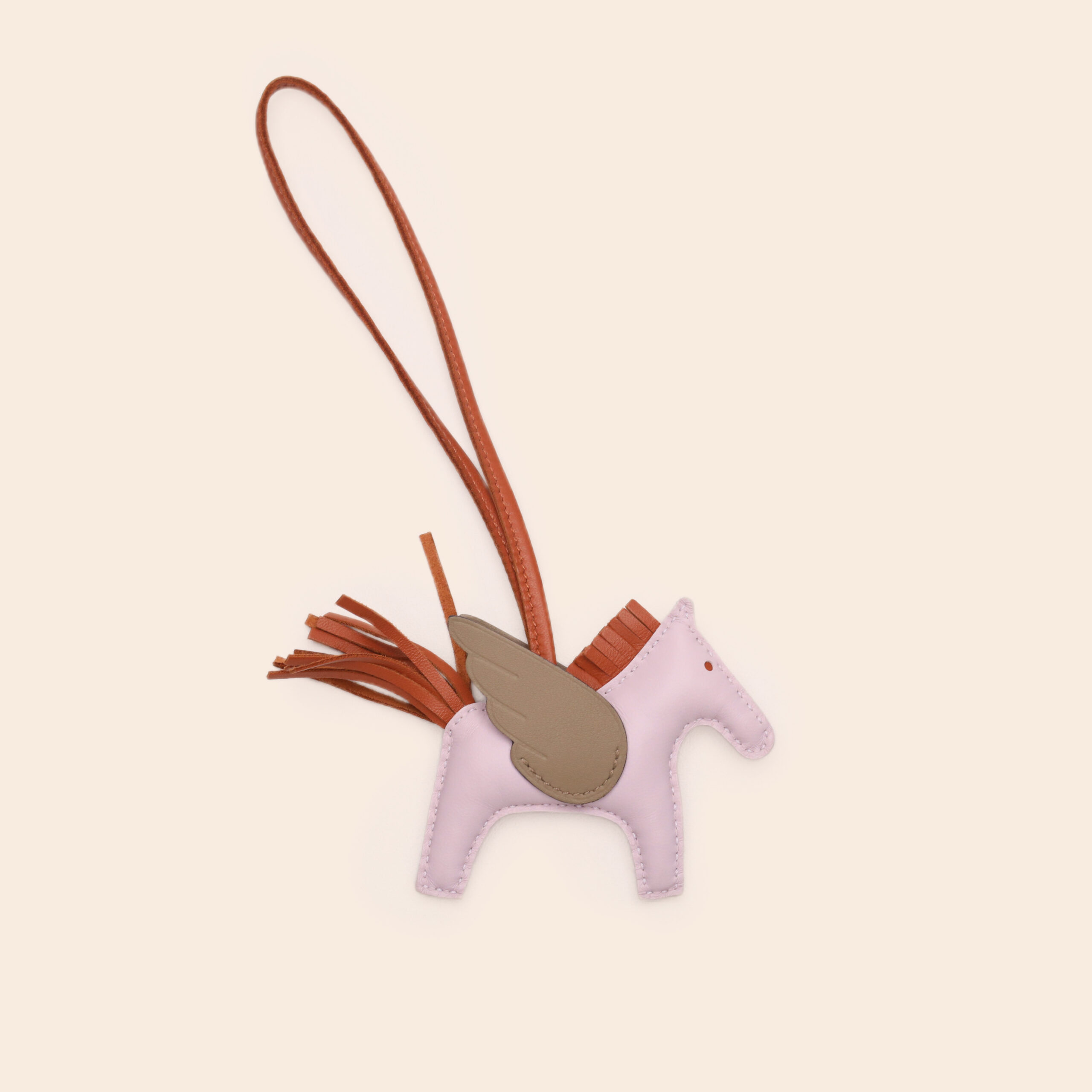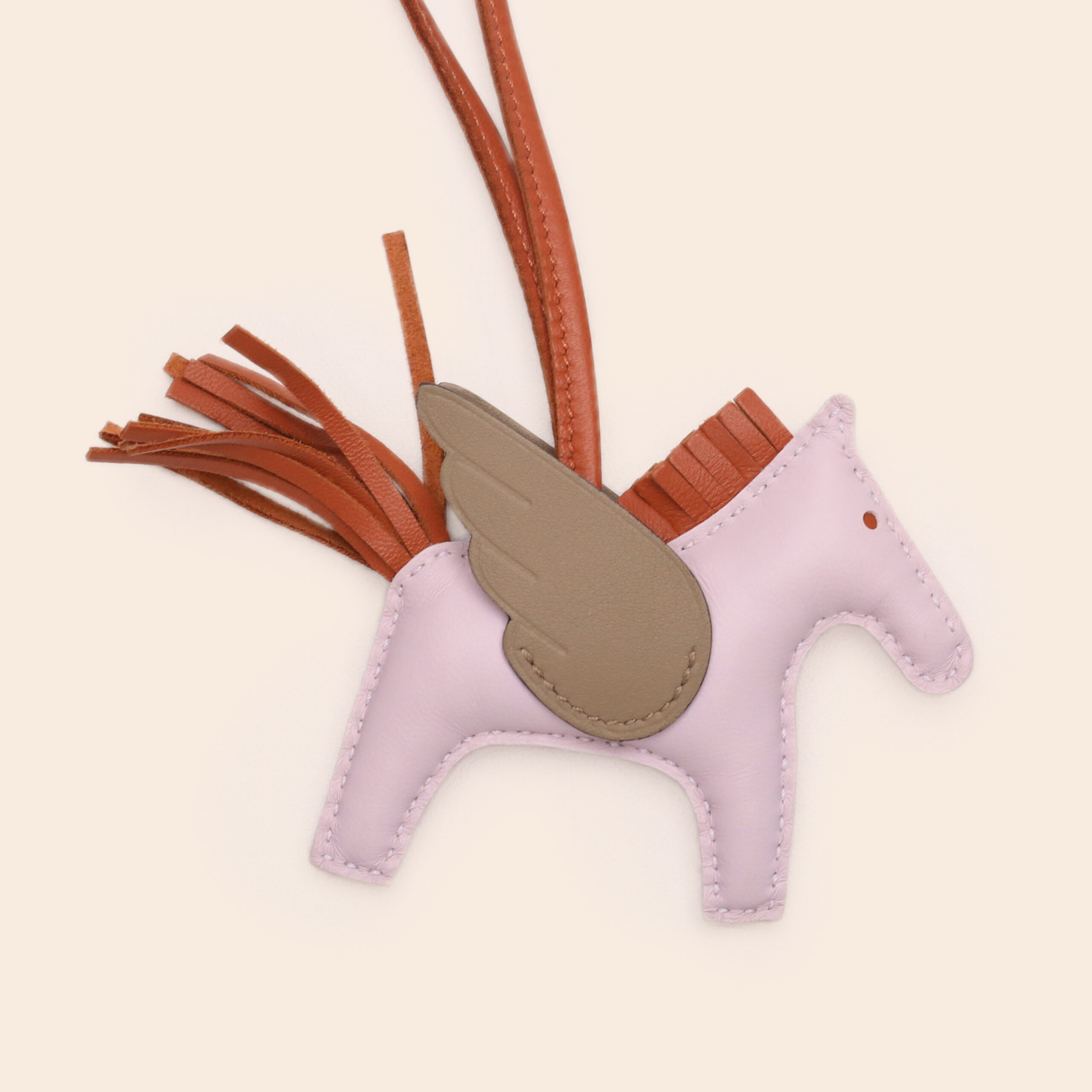 Winged horse charm in a blend of soft mauve, neutral beige, and warm copper tones. Crafted from supple Milo lambskin, this accessory adds a whimsical and elegant accent to your Hermès bag.