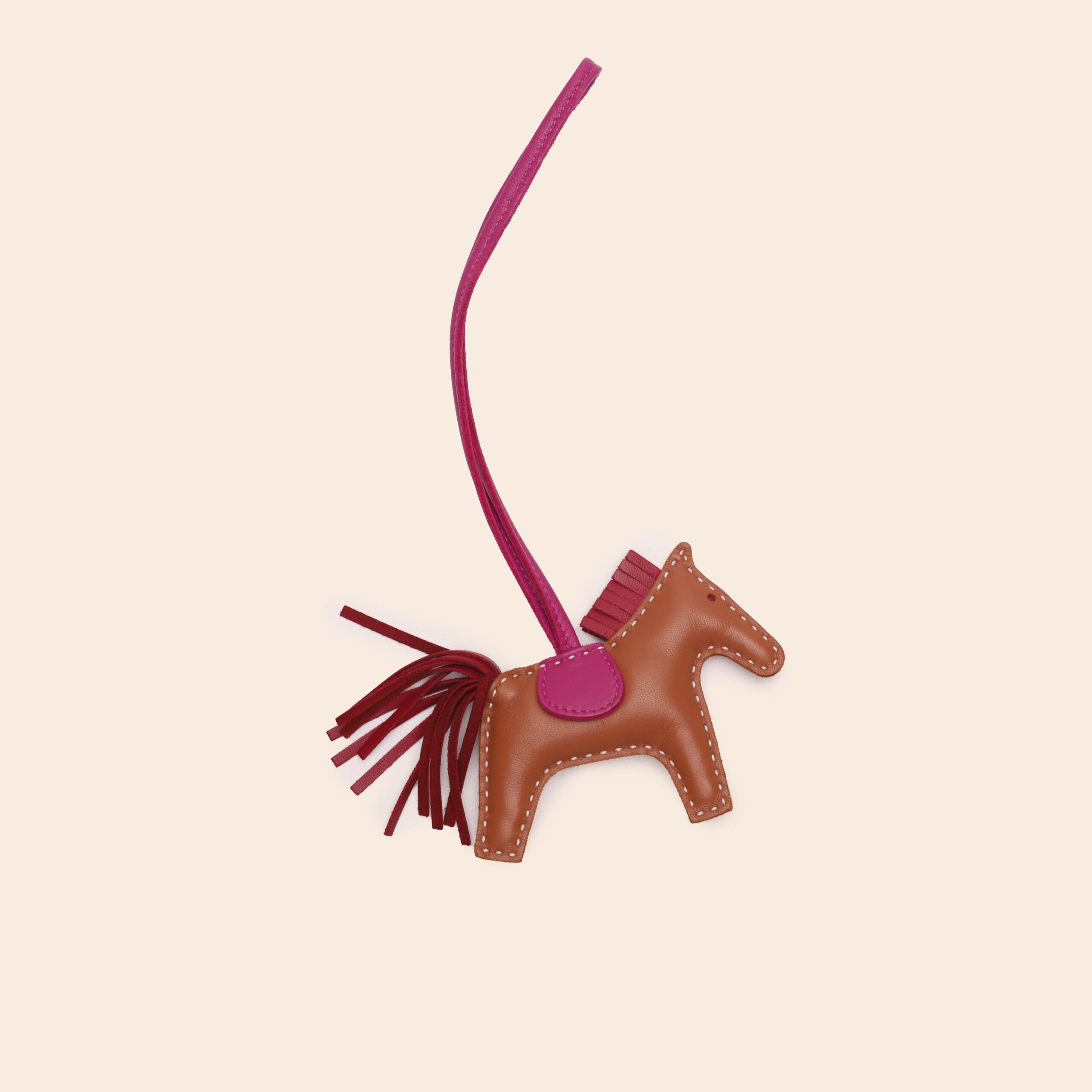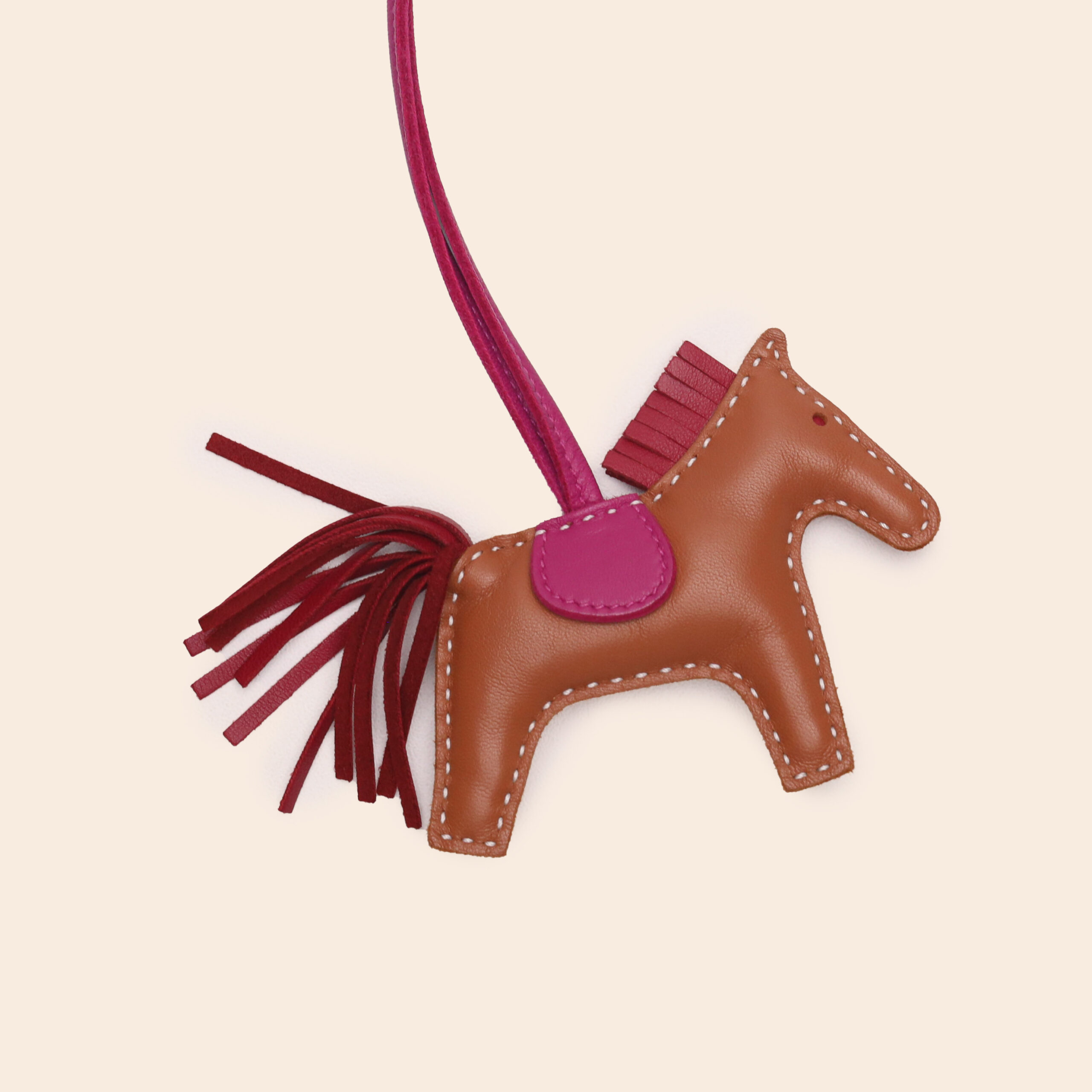 The Hermès Rodeo PM in Gold, Rubis, and Rose Y is a horse-shaped bag charm crafted from soft Milo lambskin. Its warm and cheerful color combination adds a playful yet elegant accent to your Hermès bag.
