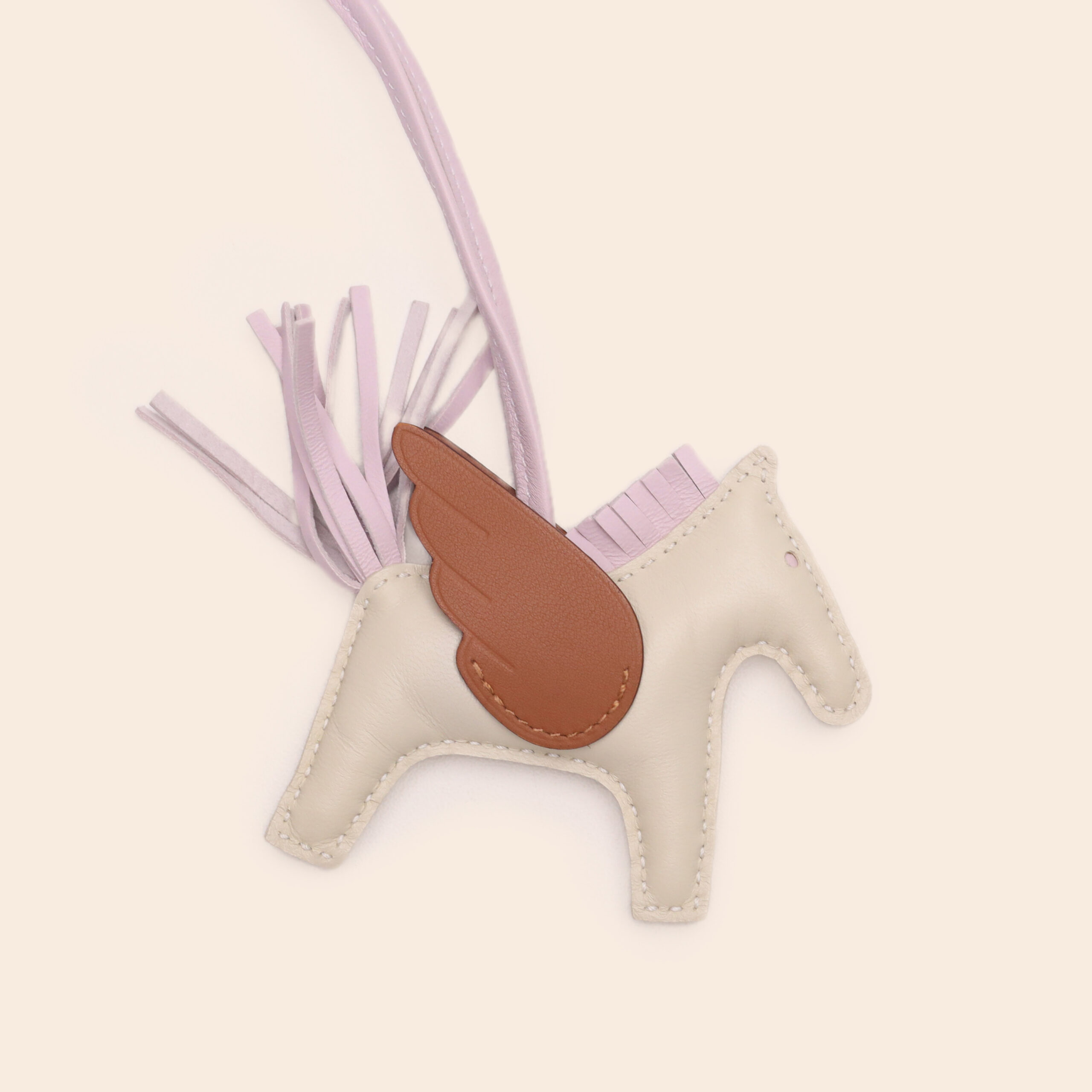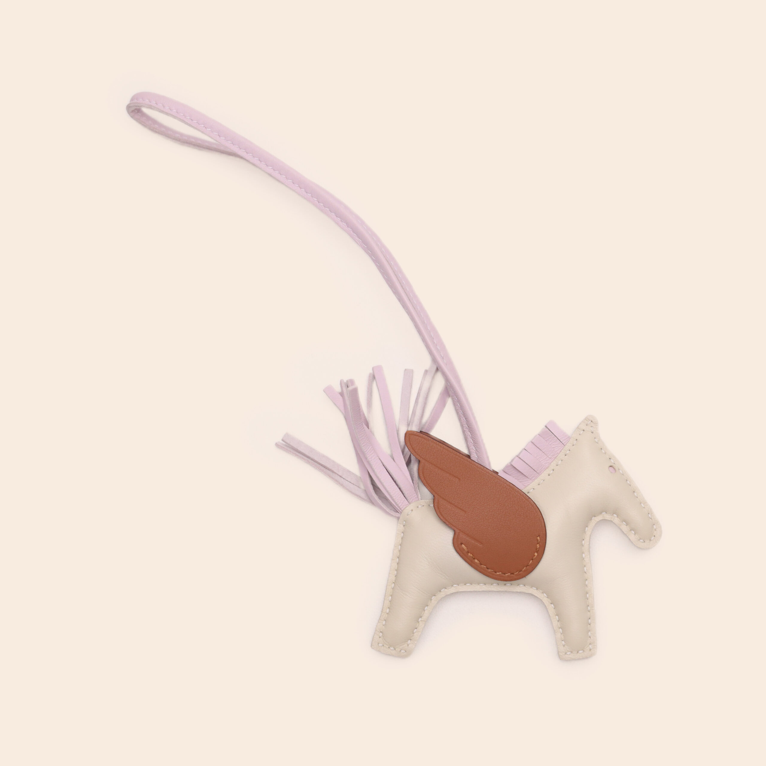 A winged horse bag charm in golden brown, cream, and mauve sylvestre. Made of soft Milo lambskin, it adds a whimsical and feminine touch to your Hermès bag.
